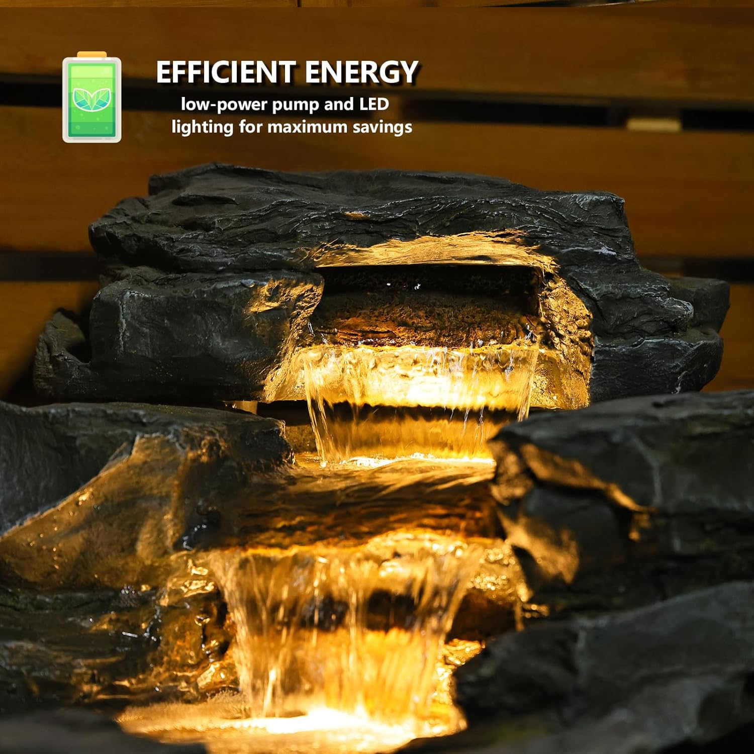 - GARDEN WATERFALL FOUNTAIN: This running water fountain has built-in golden lighting to create a warm atmosphere. The waterfall fountain will turn into a magnificent indoor decoration at night.