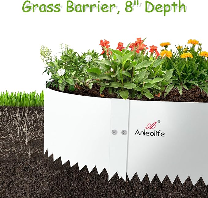 A ANLEOLIFE 6 Pack 40" LX 8" H Galvanized Steel Garden Landscape Edging, Bendable Hammer-in Metal Lawn Border with Gloves and 10 Stakes (20FT Total) (8 inch Tall, Antique White)