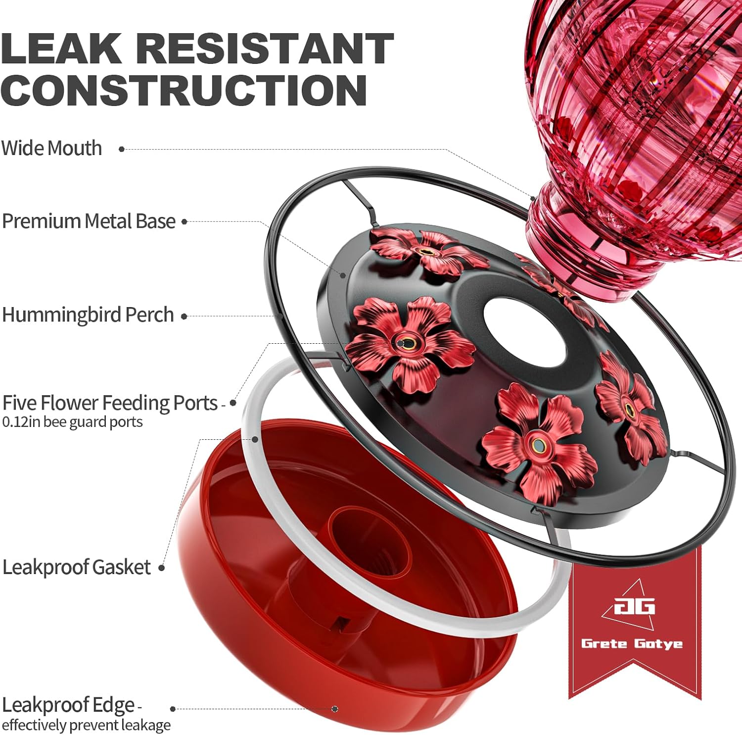 - ATTRACT HUMMINGBIRDS - This humming birds feeders for outside design with vibrant colors and intricate details, made of high-quality nectar glass container in a nice retro style ball shape, ensuring longevity and durability compared to plastic counterparts. Ensuring long-lasting use in outdoor conditions throughout the year and never fading. 5 flower shaped feeding ports, 26 oz capacity with 5 feeding station, and perch in a circle to accommodate multiple hummingbirds.