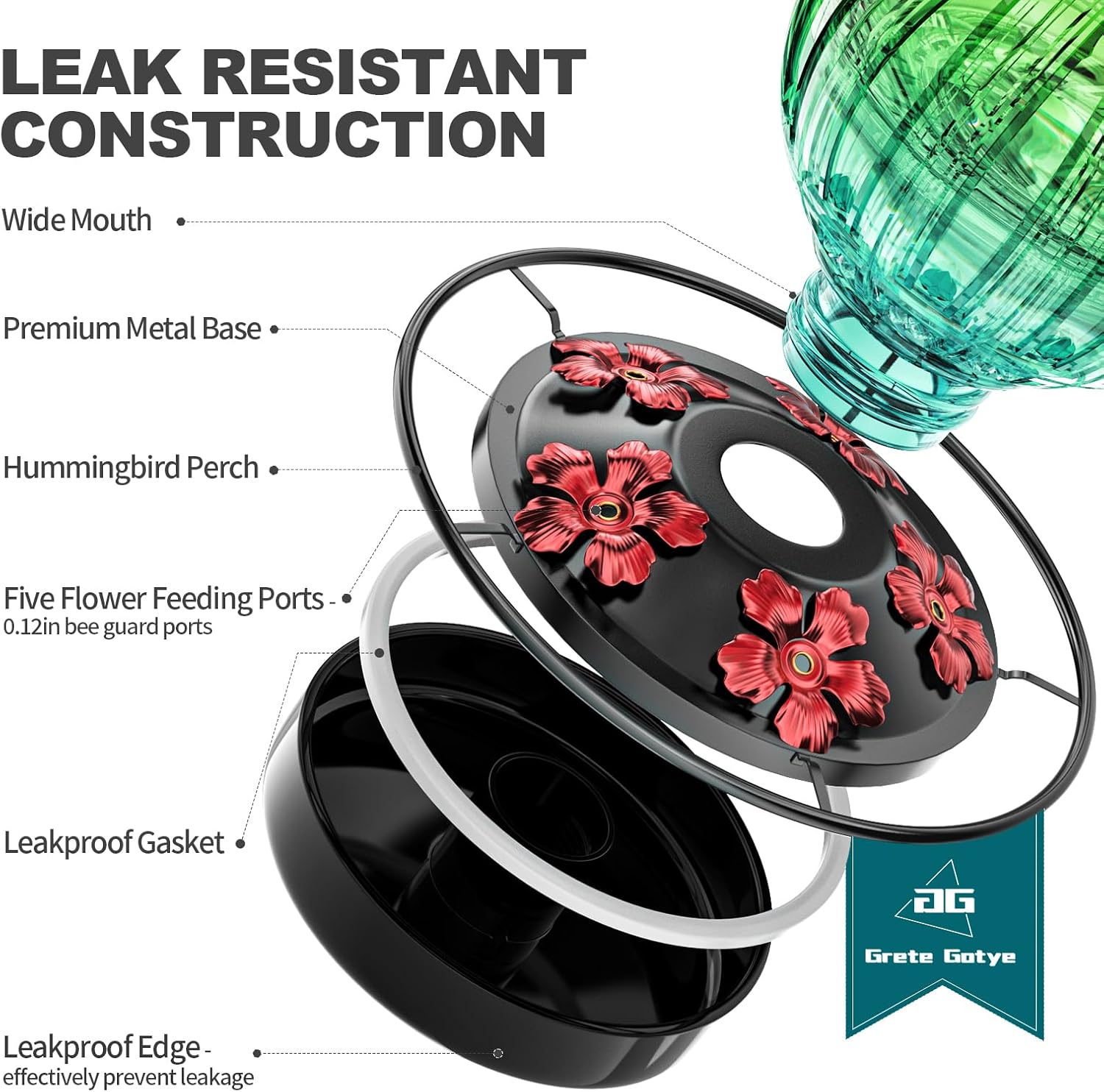- ATTRACT HUMMINGBIRDS - This humming birds feeders for outside design with vibrant colors and intricate details, made of high-quality nectar glass container in a nice retro style ball shape, ensuring longevity and durability compared to plastic counterparts. Ensuring long-lasting use in outdoor conditions throughout the year and never fading. 5 flower shaped feeding ports, 26 oz capacity with 5 feeding station, and perch in a circle to accommodate multiple hummingbirds.