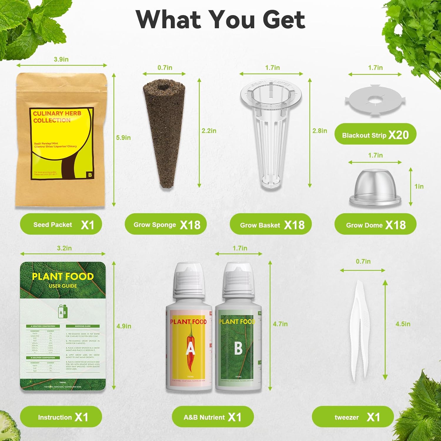- Variety of Seeds: This herb seed pod kit includes seven types of heirloom seeds—basil, parsley, shiso, liquorice, mint, cilantro, and chicory—along with 18 grow sponges, 18 grow domes, 18 grow baskets, 20 foil stickers, and A&B plant food. Perfectly designed for the Inbloom HydroGarden. With over 350 seeds, you can grow your favorites and enjoy endless indoor gardening fun!