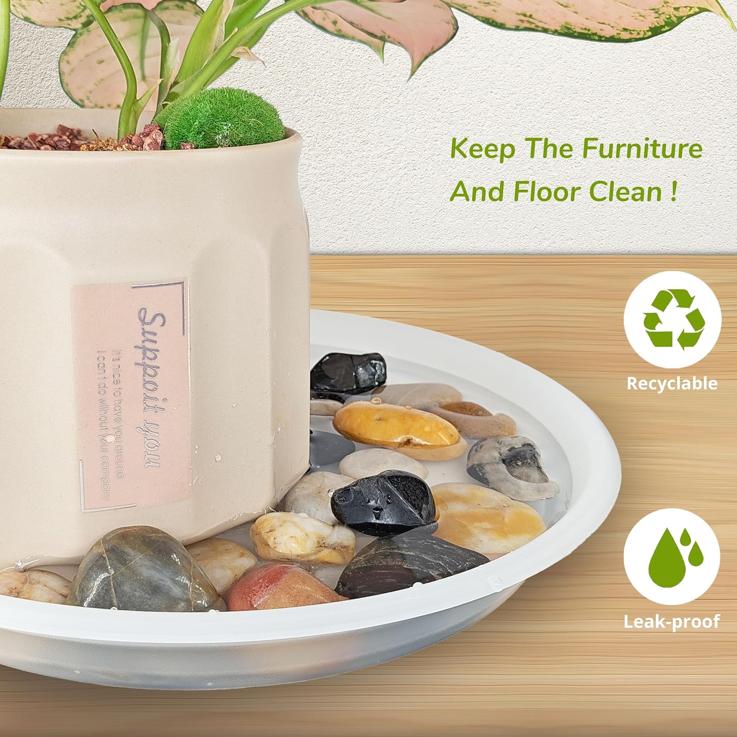 - Optimal Plant Drainage: These plant pot saucers help you catch water from the plant pot drainage hole. help protect wooden floors, carpets, and tabletops from water drainage and soil spillage. You can decorate the plant drip tray with colorful pebbles