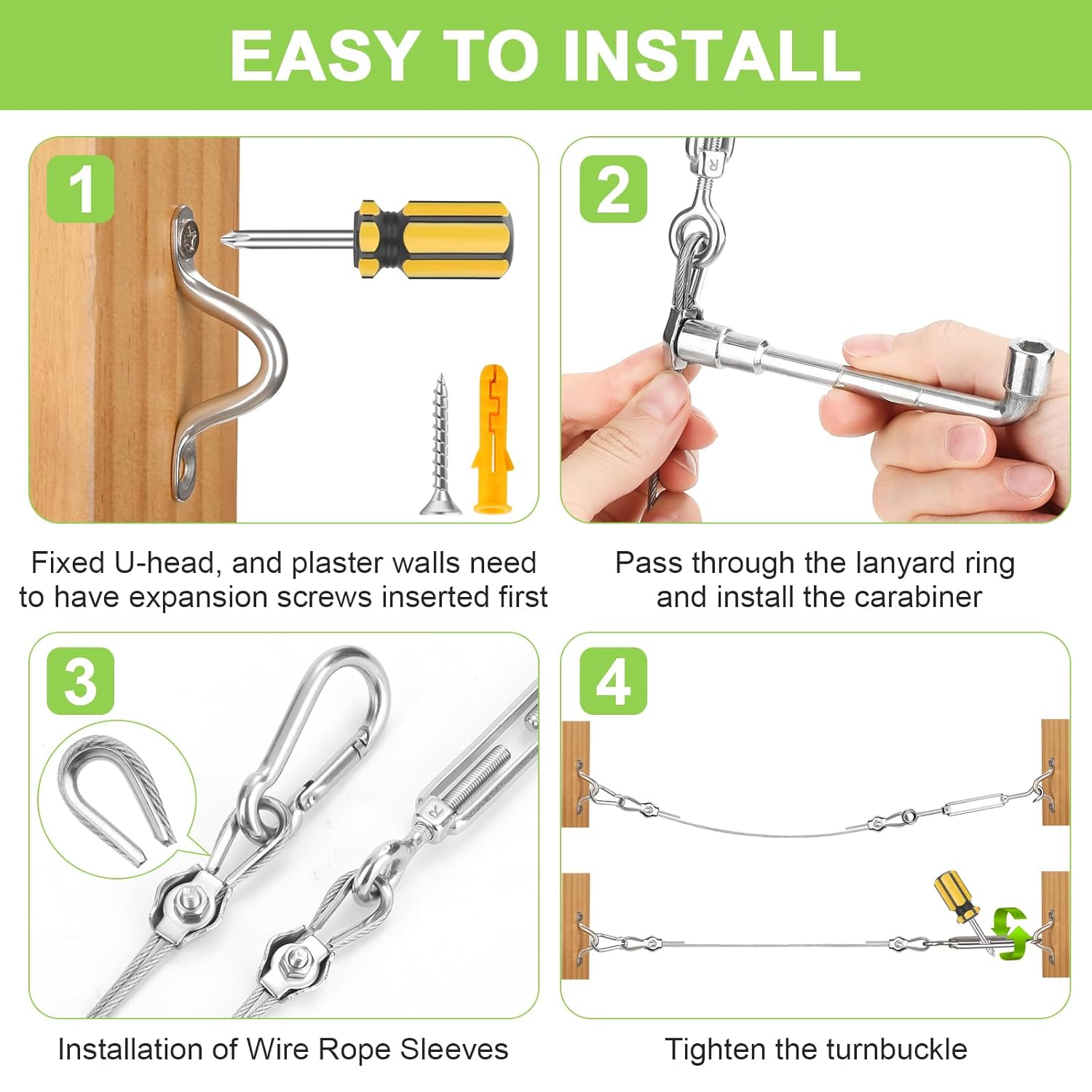 - Easy Installation: Step 1, mount the U-shaped Hump Handles on wood (Note: anchor bolts should be used if mounting on walls before installing Hump Handles). Step 2, thread the steel cable through Rope Clamps, then through the eye of the turnbuckle or Hump Handle, and secure both ends of the cable with aluminum sleeves using a screwdriver, no need for wire clamps. Step 3, attach the snap hook, adjust the tension, and secure it. It's detachable, adjustable wire rope, reusable, and easy to use!
