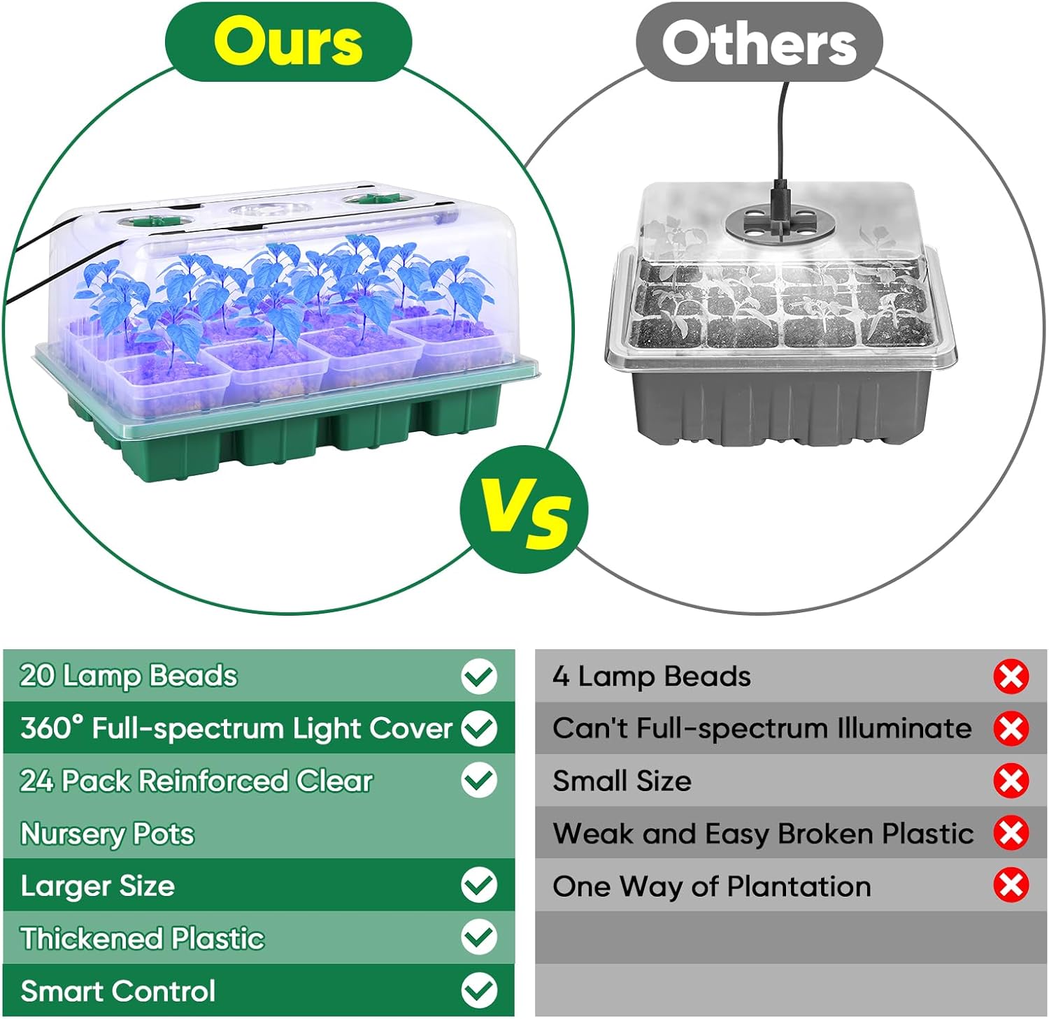 - 【24 Pack Reuseable Clear Nursery Pots,80 Lamp Beads】 Comes with 24 pack clear nursery pots, it is reuseable and made of silicone base which will make the soil come out and transplanted easily. Our lamp beads is numerous, and you can see on the strips,there is 20 pcs on each light, it can fully illuminate on every seeds, spectrum is 360°. It will help houseplant growth healthier and faster.