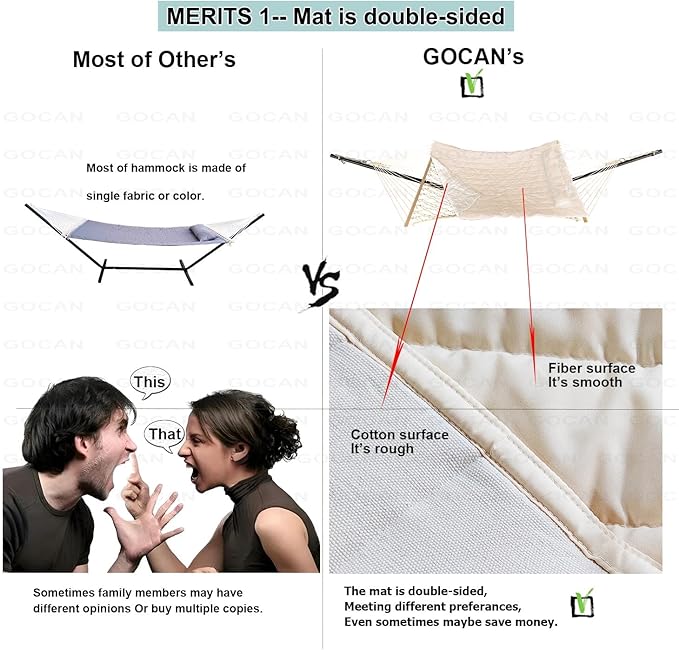 - ☀ THOUGHTFUL DESIGN: Hammock is made of high strength cotton rope. it's easy to clean, healthy,quick dry.Pure handmade, every stitch is full of emotions.The cushion and pillow are both double-sided, with one side made of silky polyester fabric and the other side made of coarse cotton fabric. Both sides can be used to meet the different preferences of family members.Pillow filling is denser and more elastic than most of others. The spacing between stitches is exactly the most appropriate 10cm, which is both soft and sturdy.