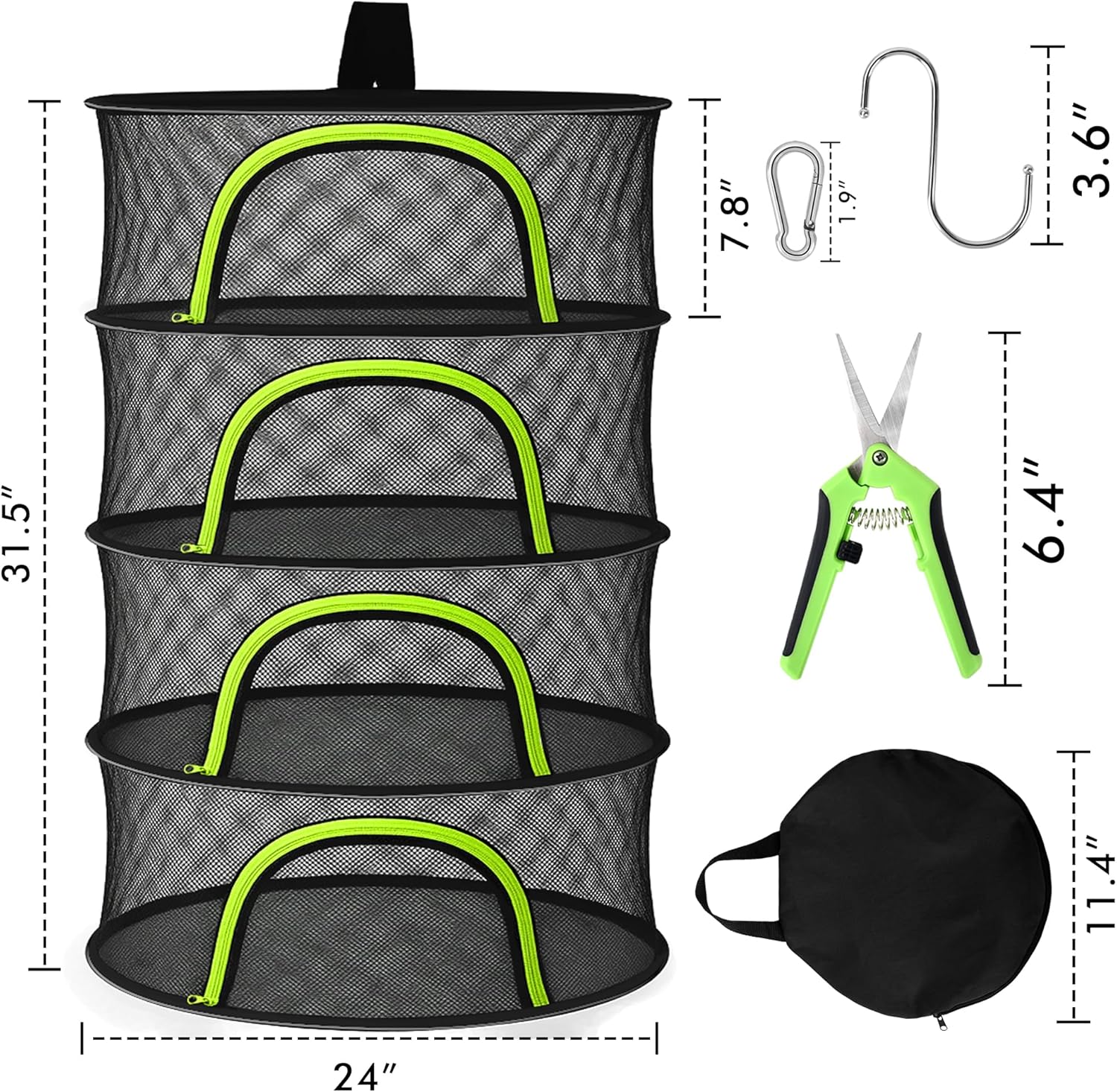 Herb Drying Rack Hanging Mesh 4 Layer 24" with Zipper, Garden Pruning Shear, Hook & Carabiner Clip for Drying Herbs, Plants, Seeds, Buds | Hydroponics & Grow Tents Herb Dryer Hanging Rack