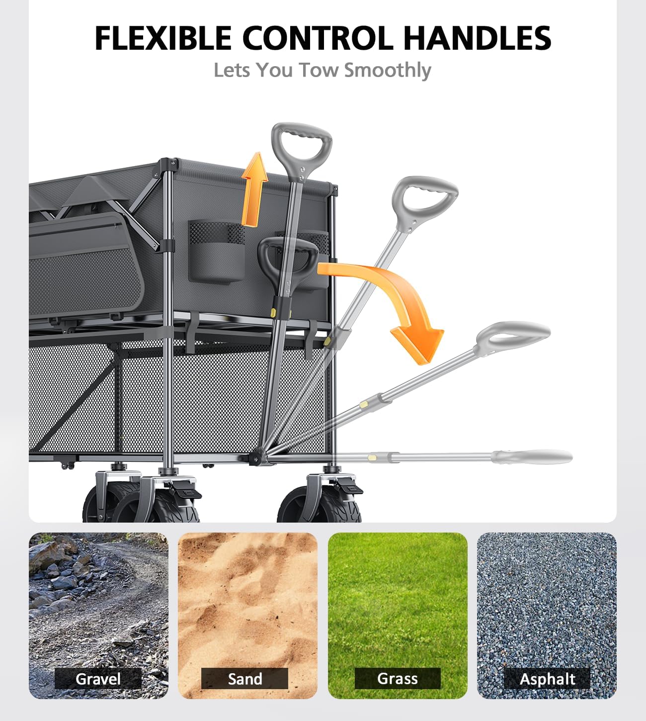 - Attention to the Smallest Details. Telescopic Tow Bar and 15.75inchs clearance on the front dual wheels, it won't hit your feet like a regular beach wagon cart! Symmetrical axle foot brakes on the wheels for easy locking, even on steep 45°grades.