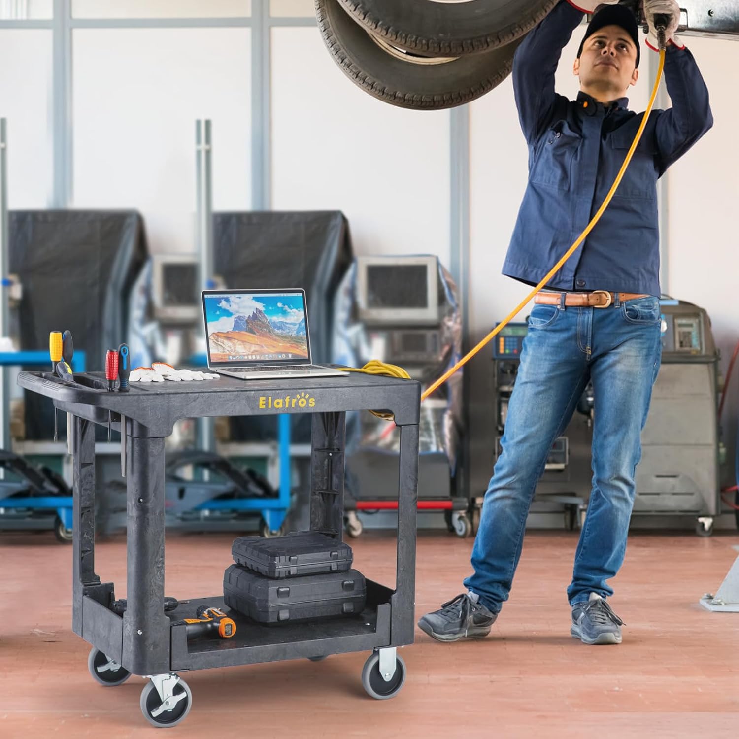 ELAFROS Heavy Duty Plastic Utility Cart Flat top 37 x 18.8 Inch - Work Cart Flat Shelves and 2 Swivel 2 Fixed Wheels Safely Holds up to 550 lbs - 2 Tier Service Cart Mail cart, Gray