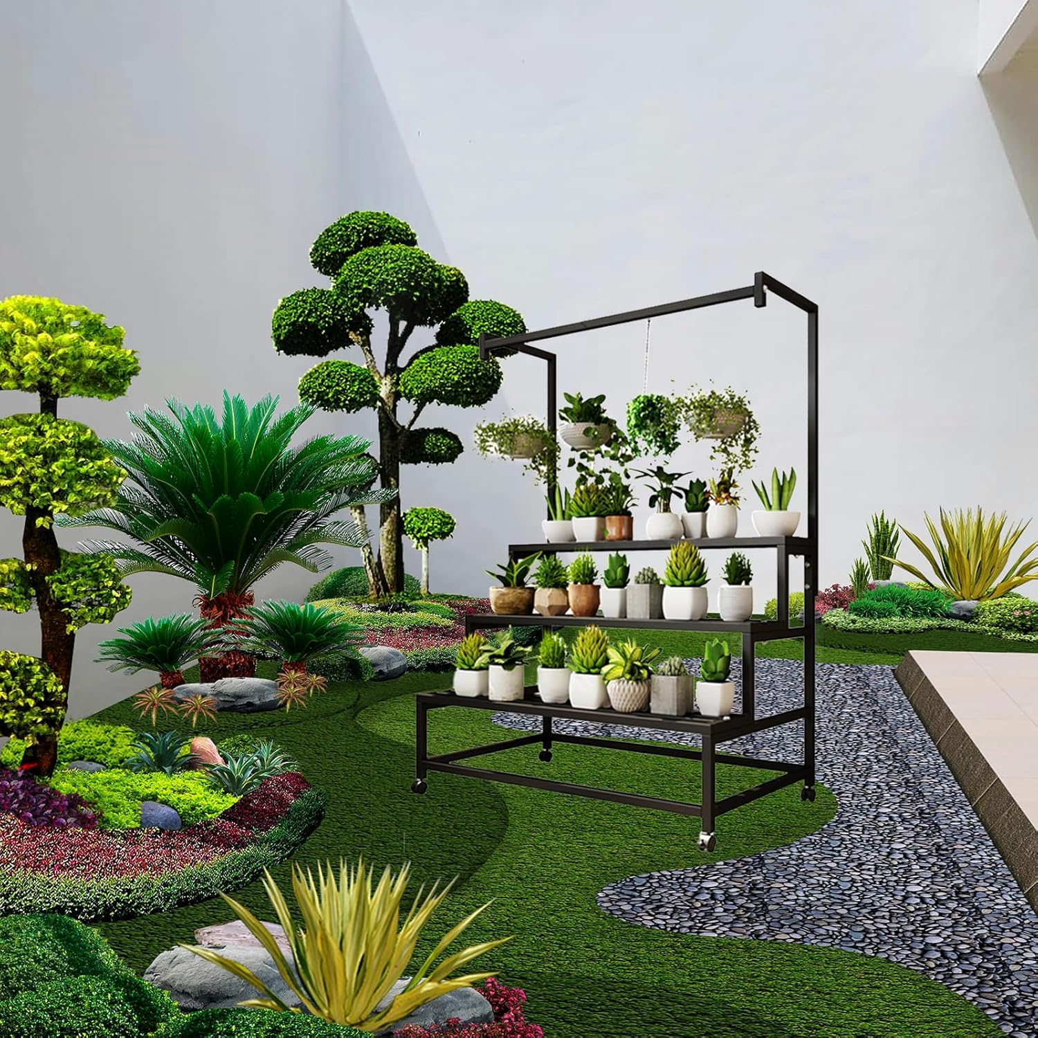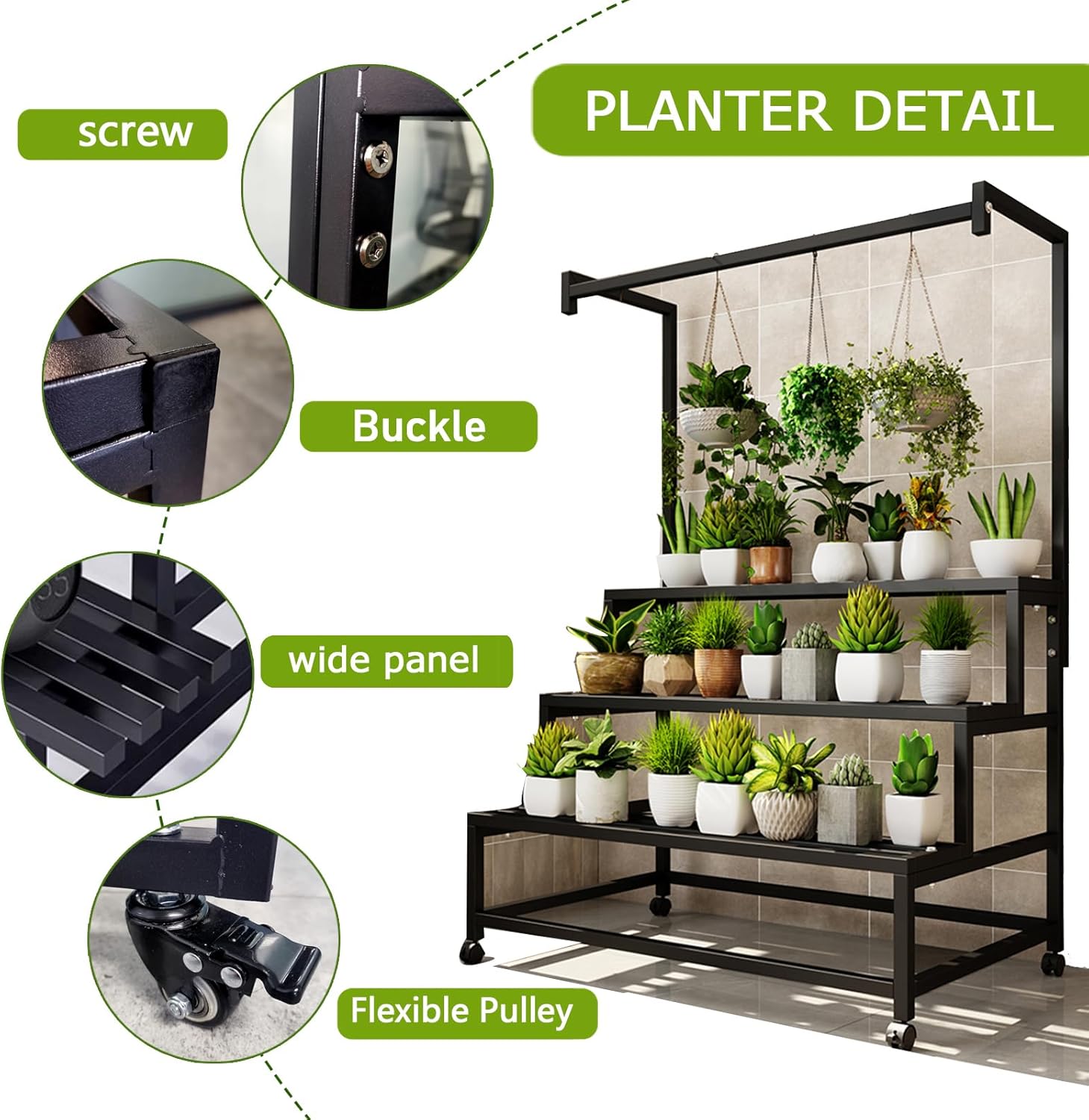- *With hanging design: This multi-tier plant stand comes with a hanging rod, which adds reasonable space for hanging basket plants, also can hang your garden tools, more convenient to use, differentiate it from ordinary plant stands.