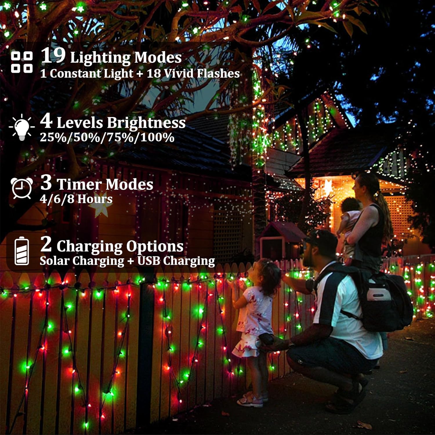 2-Pack 200FT Solar String Lights for Outside, 600 LED Extra-Bright Solar Light Outdoor with 19 Modes & Timer, Waterproof Fairy Solar Lights for Garden Patio Tree Christmas Decorations Red & Green