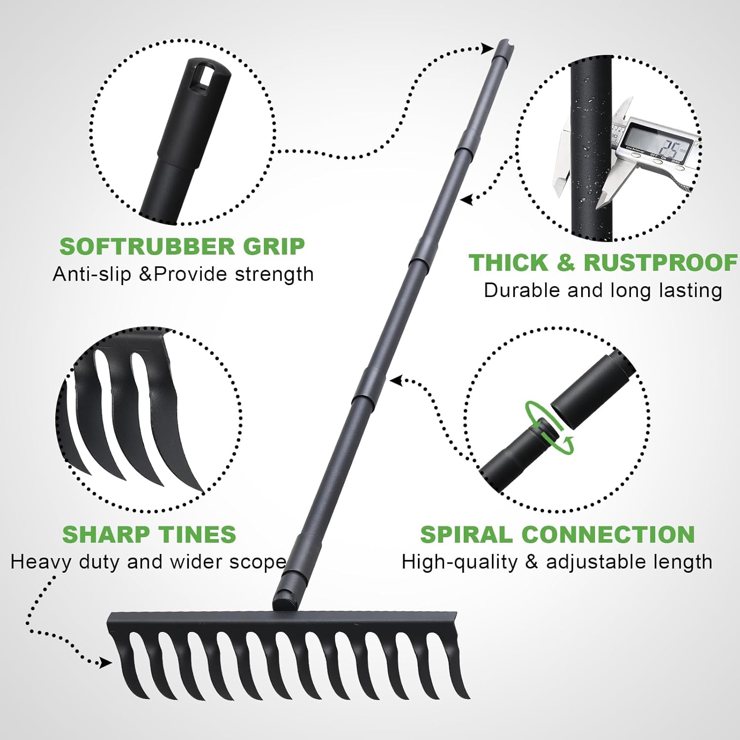 - Upgraded Sharp Rake Head: The Garden Rake features 12 sharp metal rake teeth, 2.5 inches in length, and a 17-inch wide rake head. This design allows for precise leveling, wider coverage, and deeper soil depth without damaging plant roots. With its 5 millimeters thick rake head, there are no rake teeth to break or snap, making it an effective tool for loosening soil and completing various gardening tasks.