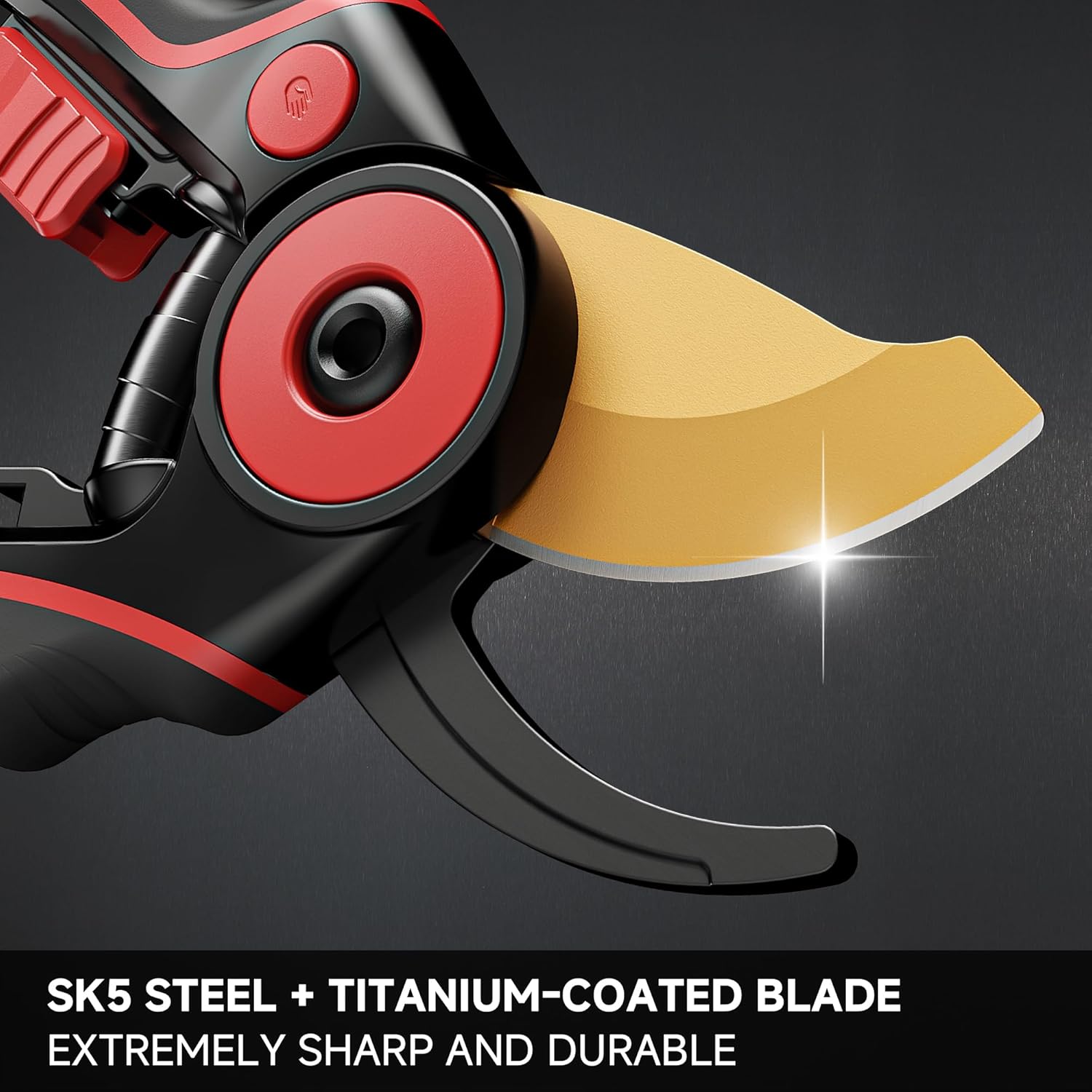 - "đȘ ăSK5 High-Carbon Steel + Titanium PlatingăUsing imported SK5 high-carbon steel forged blades from Japan, the hardness is enhanced to HRC 54 +/- 2 through heat treatment. Combined with the golden titanium coating for rust prevention and wear resistance, it has strong corrosion resistance. These hand pruners maintain sharpness over a long period, ensuring smooth and even cuts for plants, accelerating healing and preventing diseases."