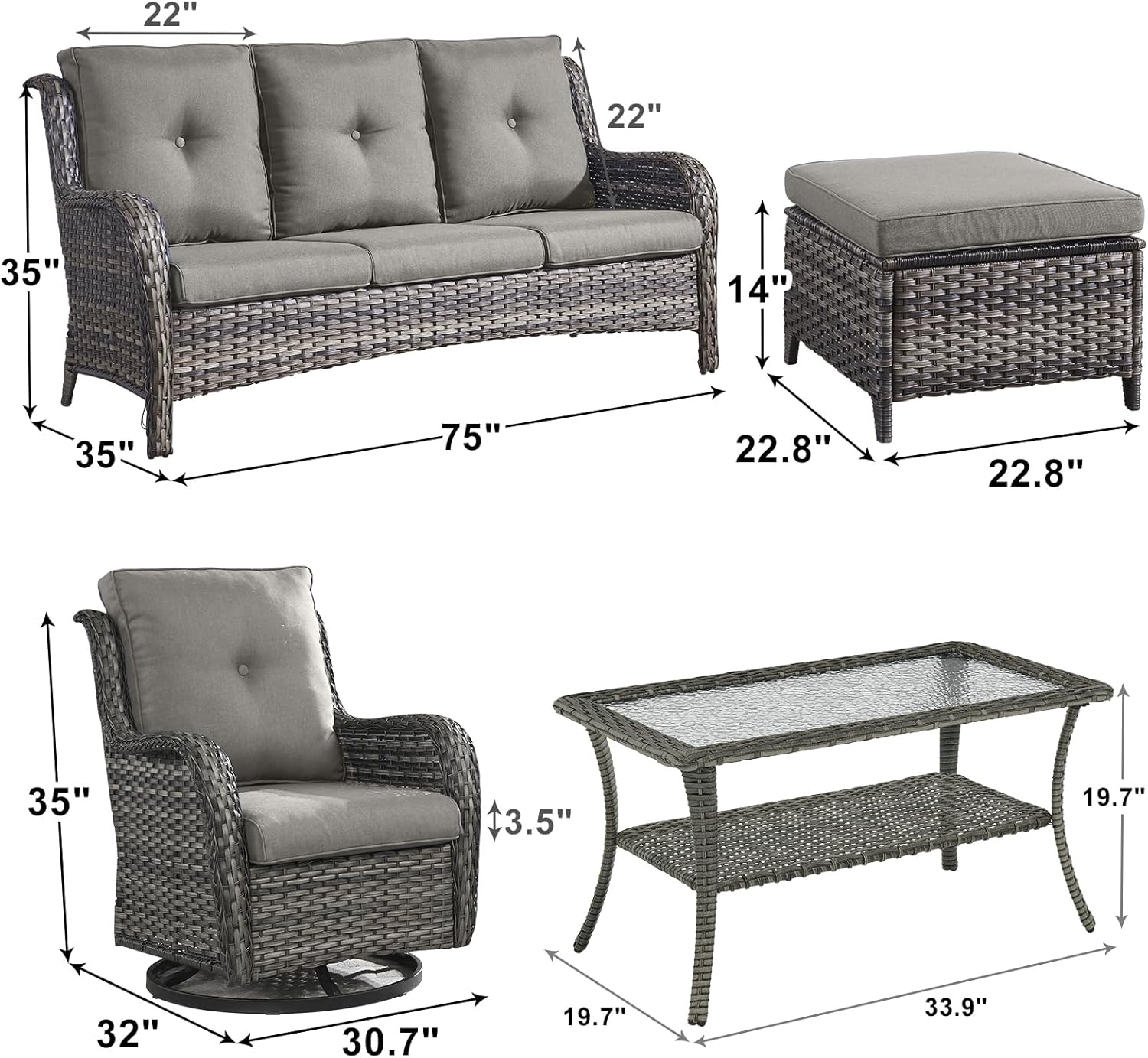 - 【Comfort Cushions & Deep Seating】This patio wicker swivel chairs and sofa feature deep and wide seats,with 4-inch thick sponge-padded seat cushions,5-inch back cushion create the ultimate patio seating experience.