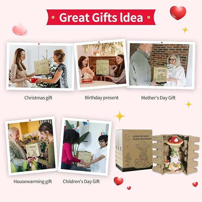 - Unique Design:The gnome is sitting under a big red mushroom, sipping coffee while slowly flipping through a book, vividly depicting the gnome's leisure life in detail. Make this garden decoration cute and charming. It is a beautiful solar powered garden gnome statue, measuring 10.43X9.05X7.68 inches.