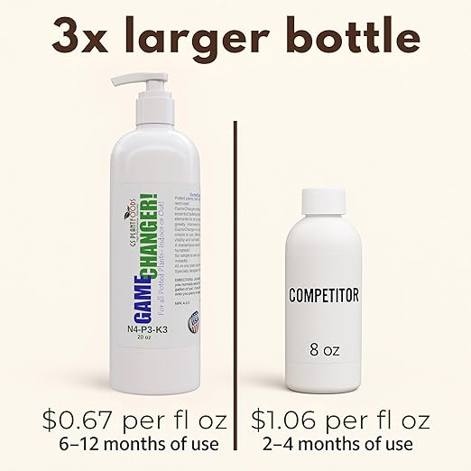 GS Plant Foods Game Changer All-Purpose Essentials - 100% Plant-Based Organic Fertilizer for Indoor or Outdoor Container Grown Plants, NPK 4-3-3, Liquid Formula for Houseplants, 20 Ounces