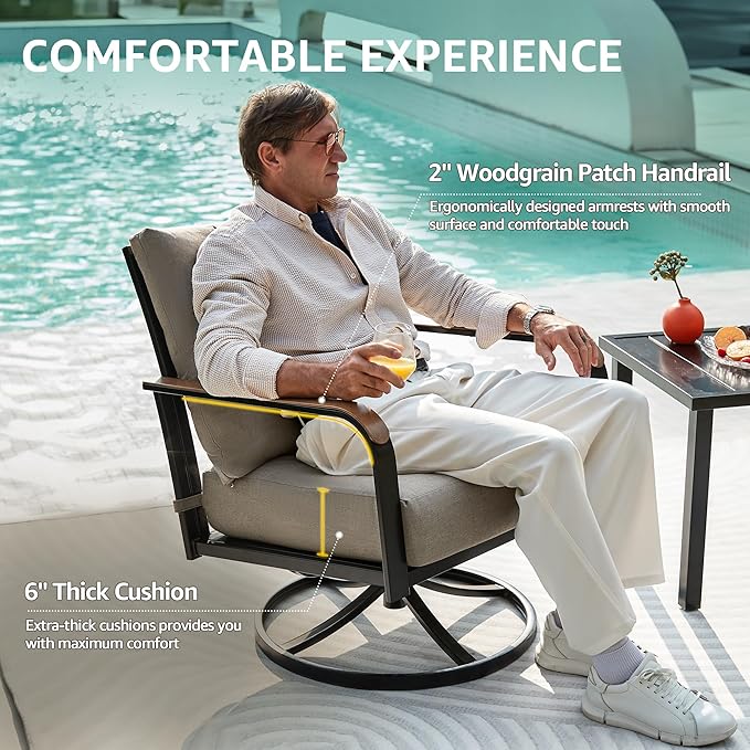 - 【Rust Resistant Frame & Wood Grain Armrest】This outdoor swivel rocker chair is made of powder coating metal frame,which is rust resistant and heavy duty, support up to 350lbs .The wood grain armrests add a sense of decoration, and the ergonomics high back can give your more comfort.