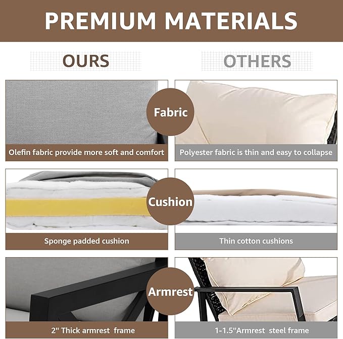 - Easy to Clean and Assemble:The Outdoor Patio Conversation Furniture Set fabric is of good quality olefin and is much better than polyester fabric in terms of sun protection and anti-aging. Weight capacity: 300lbs.A detailed installation with a complete tool kit will help you assemble the chair without any difficult. You can assemble it quickly, the assemble process will not cause you much time.