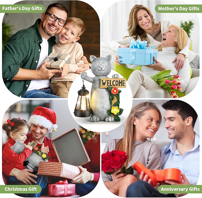 - A Great Gift: Cats are popular pets. Our cute solar cat statue is a great gift for any occasion, such as Christmas, New Year's, birthdays, Mother's Day, Father's Day, Valentine's Day, housewarming, graduation, Easter, etc. It can be given to him, her, women, men, dad, mom, wife, husband, sisters, brother, grandfather, grandmother, colleagues, kids, neighbors, or friends, etc.
