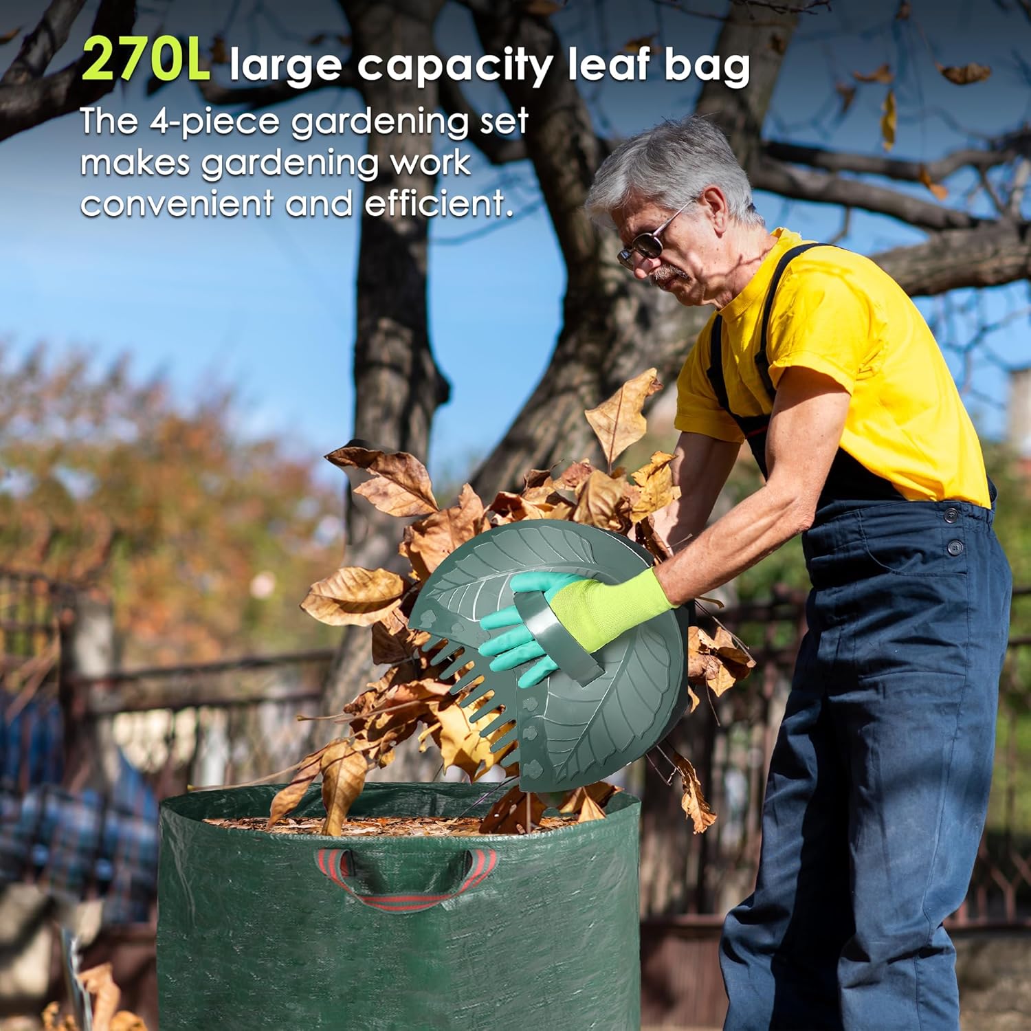 - Leaf Rake Set: Contains one garden rake for leaves, a pair of gloves, one set hand rakes and one leaf storage bag. Provides you with all the tools you need to clear your garden and collect leaves with ease and effort. It is a good helper for you to clean up the leaves in your backyard.