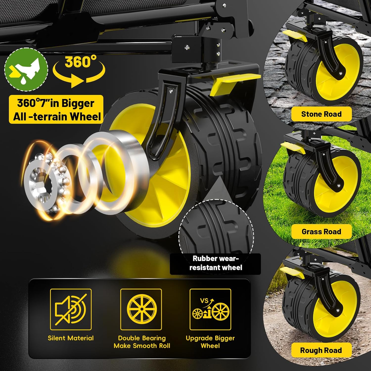 - 【7”in Upgrade All-terrain Wheels&Front Brake Design 】: Upgraded All-terrain 360°revolving wheels and large inside capacity is more applicable for all kinds of occasion such as garden,sand, camping, personal shopping,outdoor sports etc.7”in broader and durable rubber wheels have good bearing performance and better steering,Thus, it will not be out of shape and ensure that it can run smoothly for a long time. Besides front brake design make you more flexible to operate this xlarge wagon