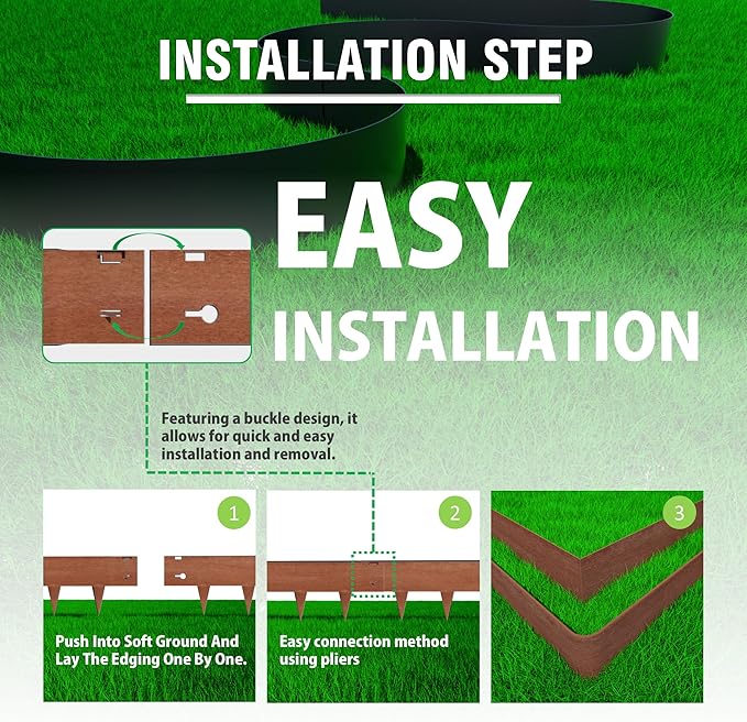 - 𝐐𝐮𝐢𝐜𝐤 & 𝐄𝐚𝐬𝐲 𝐈𝐧𝐬𝐭𝐚𝐥𝐥𝐚𝐭𝐢𝐨𝐧: Featuring a front-and-back interlocking system, this edging offers hassle-free assembly. The 4-inch sharp teeth easily penetrate the soil for a secure fit, creating a stable garden border. Simply position the edging and tap it into place—no need for complicated tools or steps.