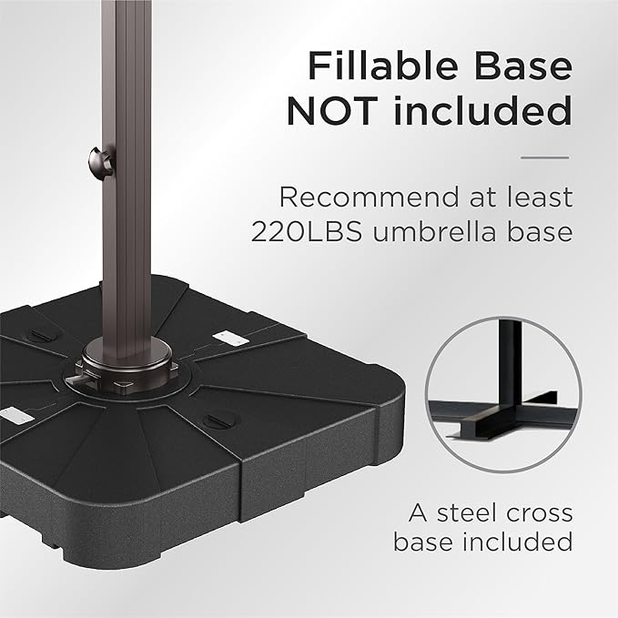 - Installation Guide: Since the patio umbrella is relatively heavy, installation requires at least two people. You can refer to the instructions or the video on the details page for a faster installation. The cantilever umbrella include a steel cross base but does NOT include the fillable base shown in the picture