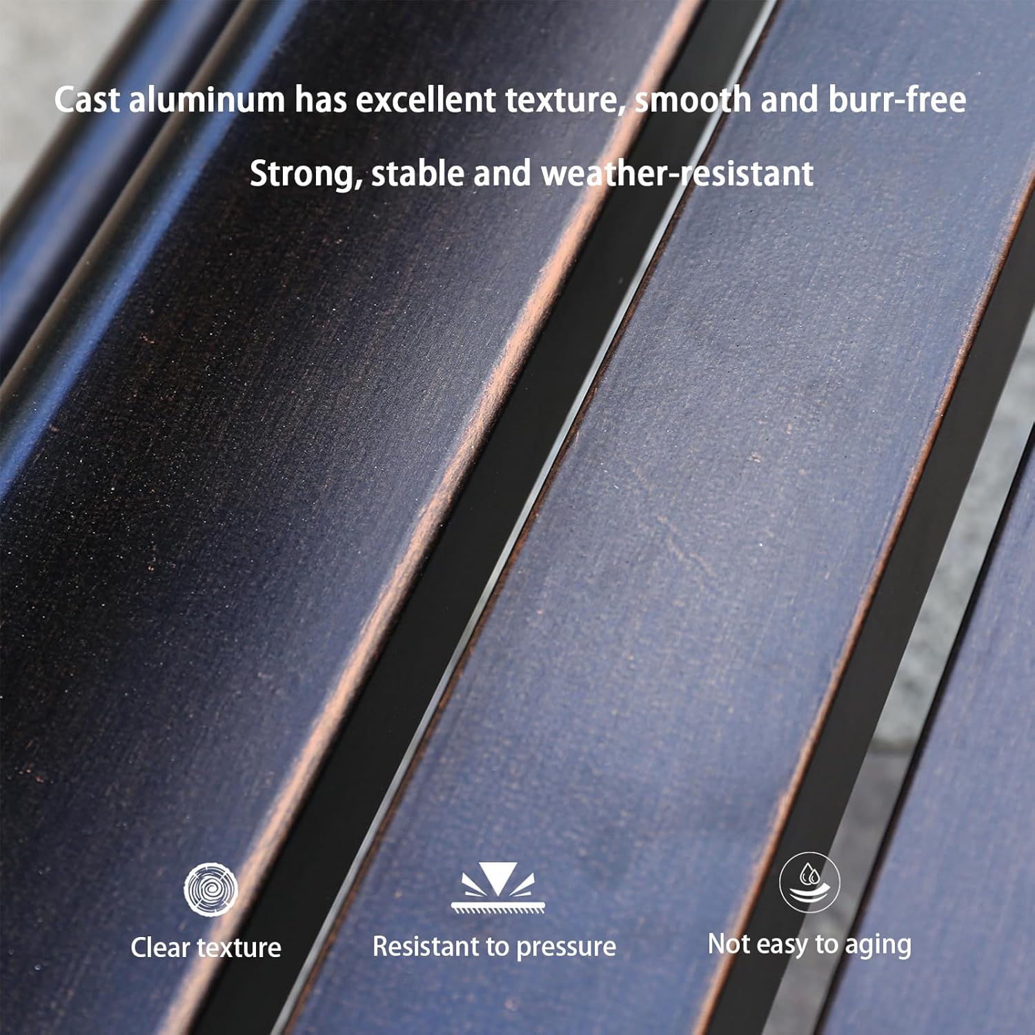 - All weather materials: Made of sturdy cast aluminum with a water-resistant and fade-proof finish. Our patio benches bistro chairs is durability and sunproof, these all-weather features will allow you to use the chairs for a long time
