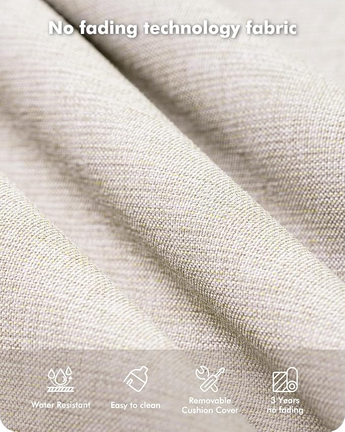 - Non-Fading Fabric:3-Year-Non-Fading,made with high-density foam that is soft and supportive, and covered with a breathable fabric that is easy to clean and maintain. The cushion covers are also water resistance, stain-resistant, ensuring they remain in excellent condition in all weather conditions