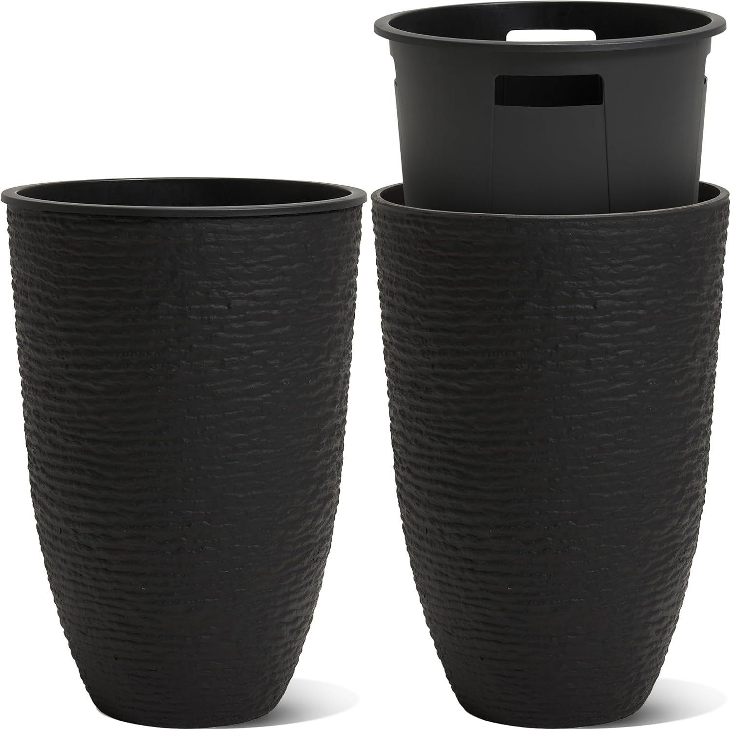 WORTH Garden 2-Pack 21" H. Black Tall Planters with Inside Pots - 14'' Dia Plastic Large Round Plant Tree Pots - Decorative Imitation Stone Finish for Indoor Outdoor Front Porch Container Patio
