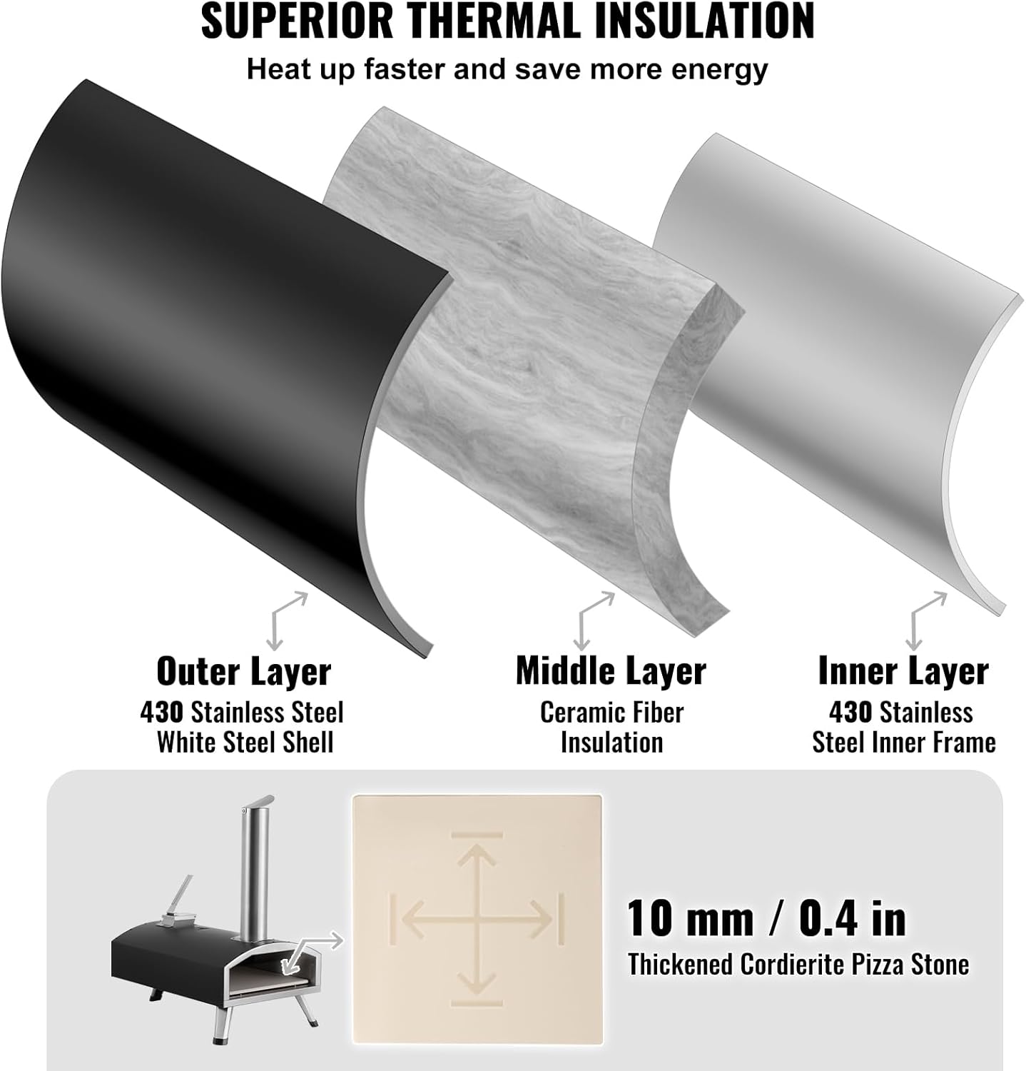 - 🍕 Durable Construction: VEVOR pizza oven withstands outdoor conditions and frequent use. Adopted a 3-layer design, promoting efficient heat circulation. Featuring a 430 stainless steel shell, and thick insulation cotton, it ensures durability and excellent heat retention