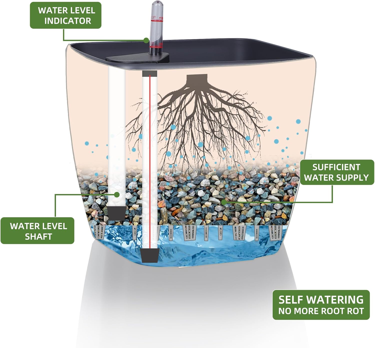 - SELF WATERING & NO MORE ROOT ROT - The smart unique sub-irrigation system is one of the most appealing aspects among all Dexceder planters. The easy-to-use separated integrated water reservoir or catcher- keeps your soil well aerated and automatic supplies plants with the right amount of ongoing moist air & nutrition for optimal growth. The insert indicator shows you the exact time to water again. The full water supply period can single-handedly last over 3 weeks based on different live plants