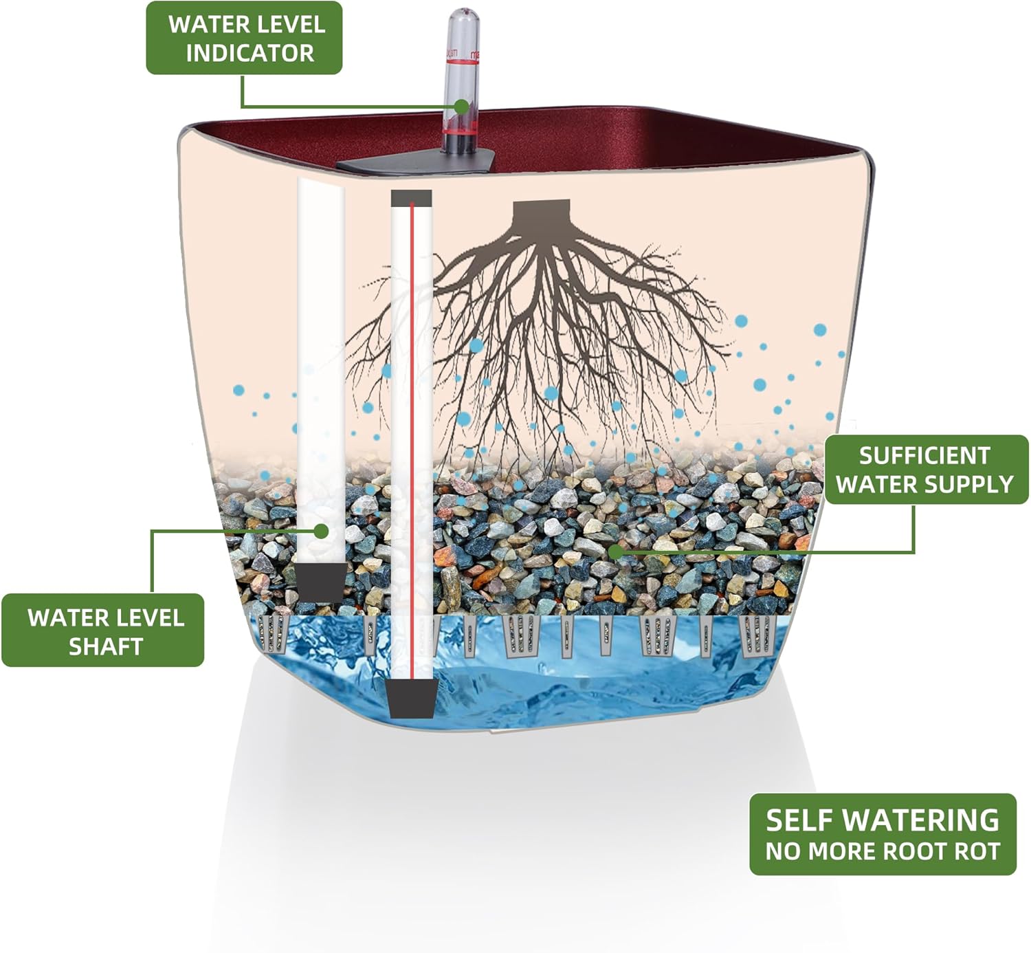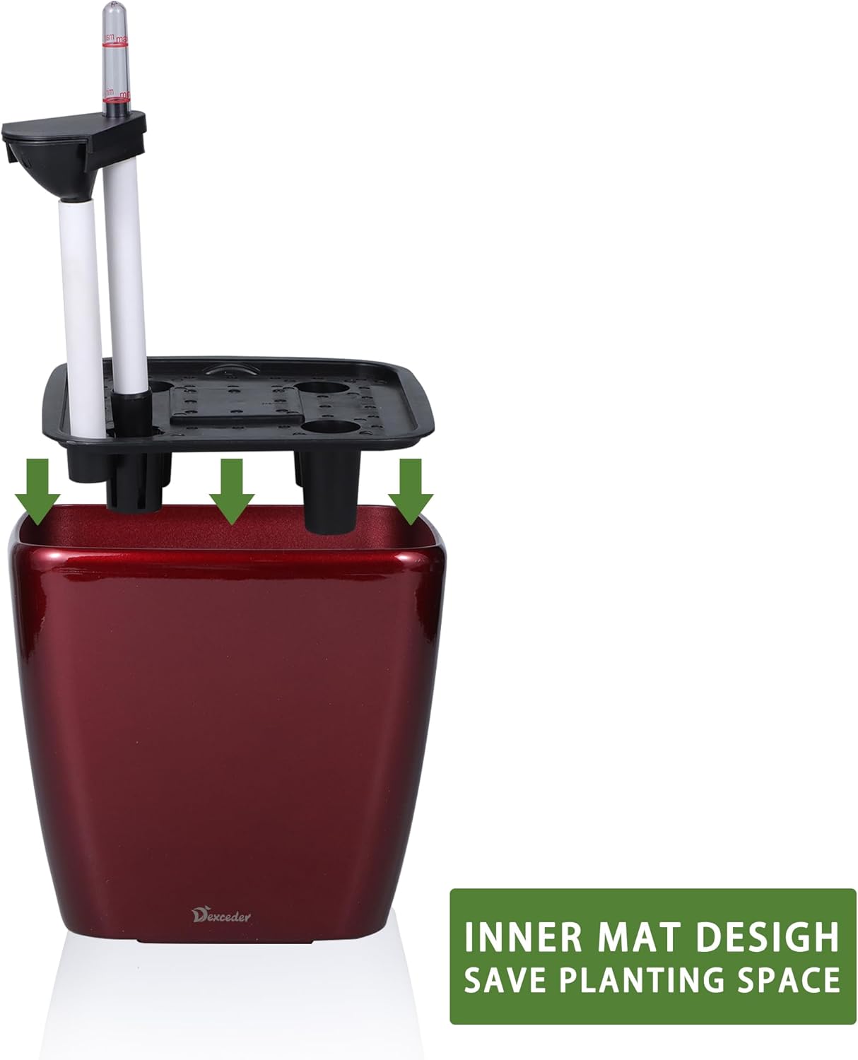 - SELF WATERING & NO MORE ROOT ROT - The smart unique sub-irrigation system is one of the most appealing aspects among all Dexceder planters. The easy-to-use separated integrated water reservoir or catcher- keeps your soil well aerated and automatic supplies plants with the right amount of ongoing moist air & nutrition for optimal growth. The insert indicator shows you the exact time to water again. The full water supply period can single-handedly last over 3 weeks based on different live plants
