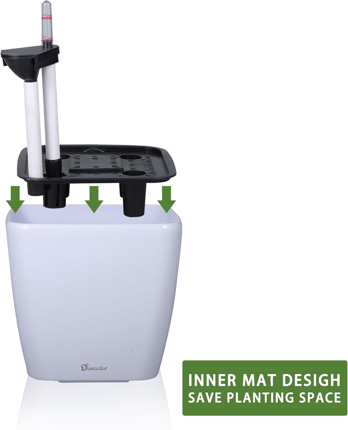 - SELF WATERING & NO MORE ROOT ROT - The smart unique sub-irrigation system is one of the most appealing aspects among all Dexceder planters. The easy-to-use separated integrated water reservoir or catcher- keeps your soil well aerated and automatic supplies plants with the right amount of ongoing moist air & nutrition for optimal growth. The insert indicator shows you the exact time to water again. The full water supply period can single-handedly last over 3 weeks based on different live plants