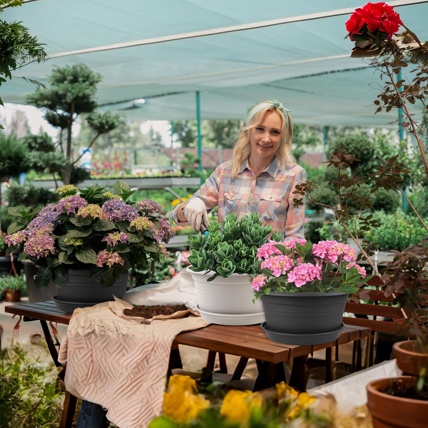- 【Excellent Drainage and Tray】10 inch plant pot set of 6, each plastic flower pots comes with a tray and multiple drainage holes, excess water will flow out of the drainage holes at the bottom of the outdoor plant pots to prevent overwatering. The planter pots tray collects spilled water and soil for easy cleanup.