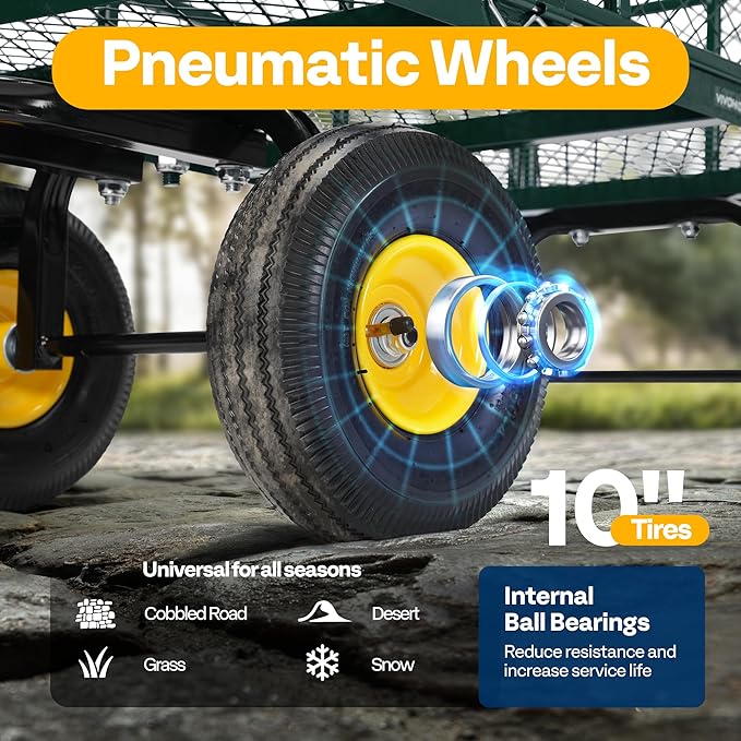 - NOISE REDUCTION TIRES: Our garden cart adopts 10-inch pneumatic tires, featuring good elasticity, impact resistance, and noise reduction; And the tires are fixed by lug nuts for further stability; The tight-turning steering and sturdy 4-wheel design ensure smooth moving to tackle any terrain; PLEASE BE AWARE that the tires are not fully inflated due to safe transport consideration