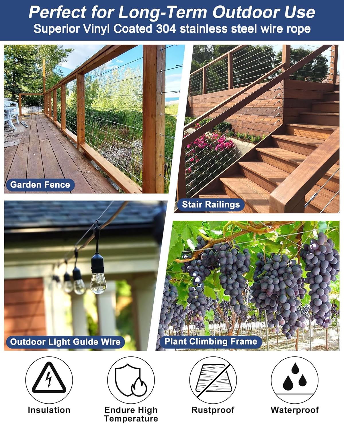 - Recommended Uses For Product : Outdoor Hanging String Lights Guide Wires, Clothes line Wire, Climbing Plants, Garden Railings, Outdoor Chandeliers, Patio Tent Ropes, Picture Displays, Canopies, Pergolas, Curtains, Deck Cable Railings, Festival Hanging Decorations Outdoor Hanging String Lights Guide Wires, Clothes line Wire, Climbing Plants, Garden Railings, Outdoor Chandeliers, Patio Tent Ropes, Picture Displays, Canopies, Pergolas, Curtains, Deck Cable Ra… See more