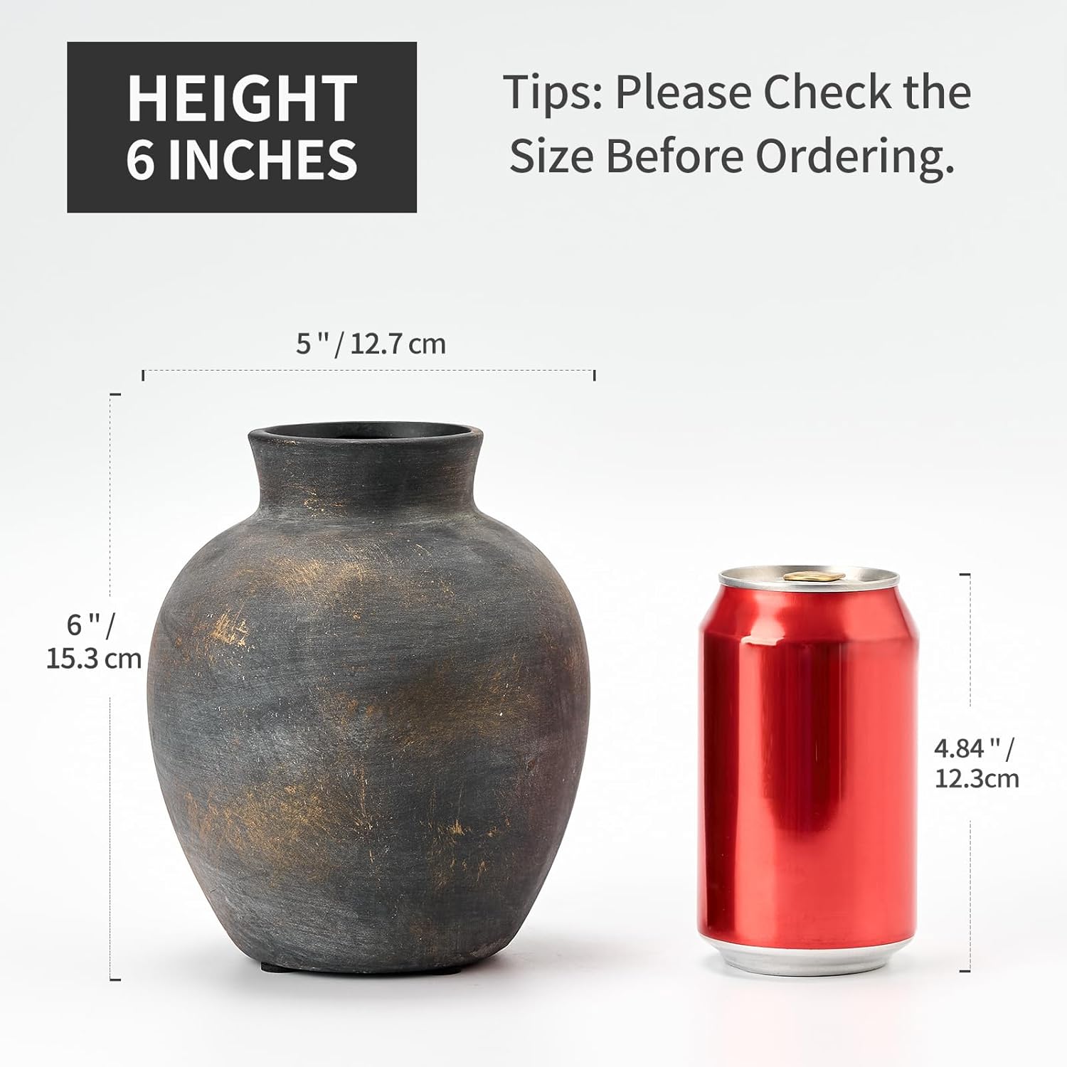 - šššš¬š®š«šš¦šš§šš¬: The rustic vase measures 6" height and 5" width with 2.4" opening.Perfect for greenery and dry or faux florals,but also can hold water for fresh flowers.The vase itself can be displayed indoors or outdoor as a fine decorative piece.