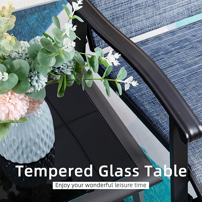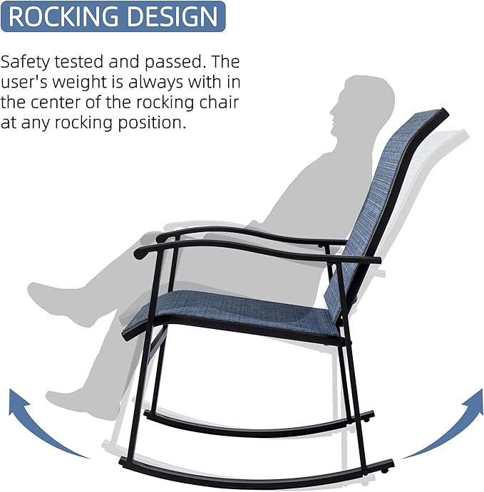 Vongrasig 3 Piece Outdoor Rocking Bistro Set, Textilene Fabric Small Patio Furniture Set, Front Porch Rocker Chairs Conversation Set with Glass Table for Lawn, Garden, Balcony, Poolside (Denim Blue)