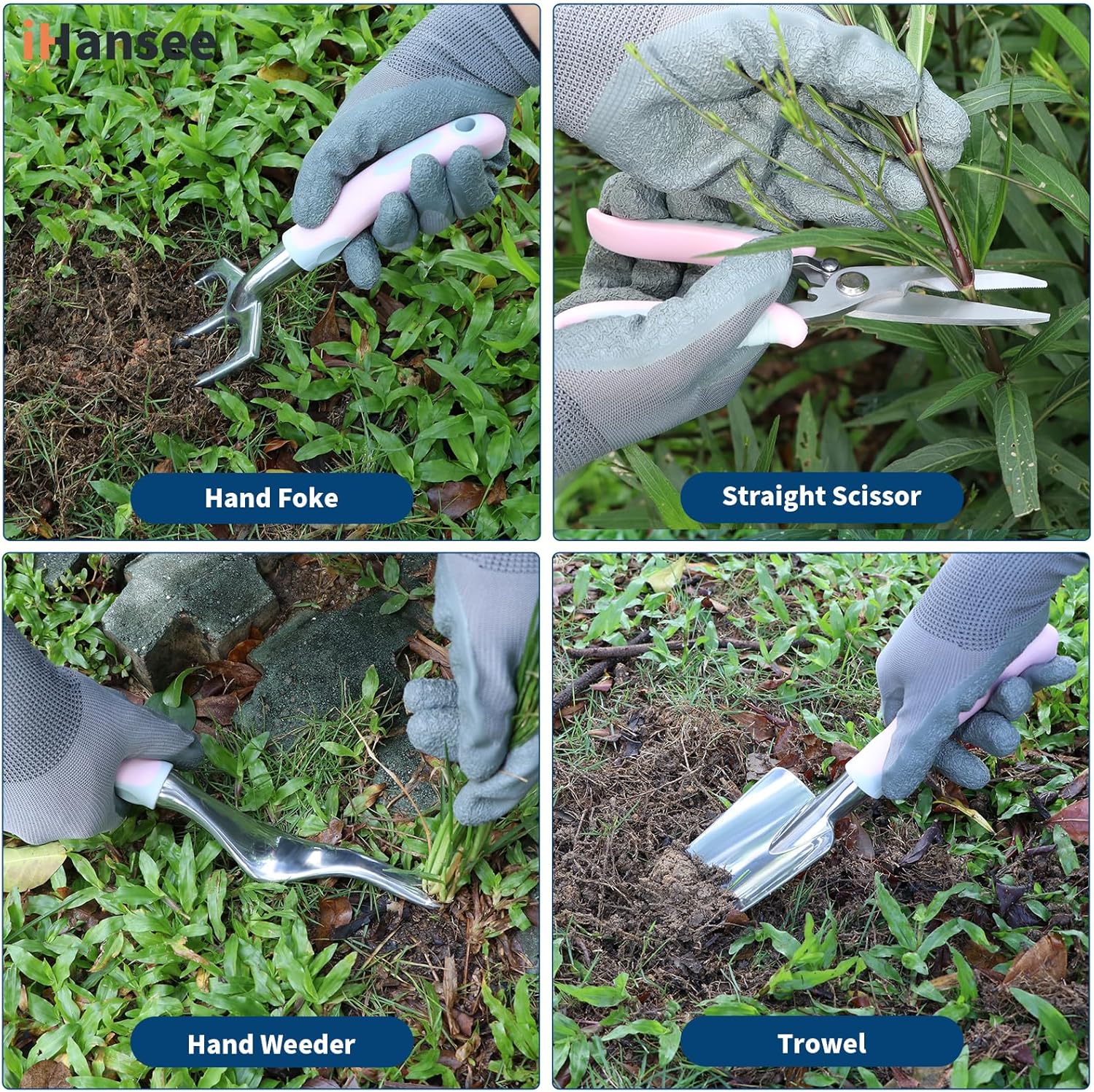 Pink Garden Tool Sets 12 Pieces, iHansee Aluminum Gardening Hand Tools with Non-Slip Handle, Kneeling Pad, Apron, Gloves and Organizer Bag, Landscaping Tools - Gift for Women & Garden Enthusiasts