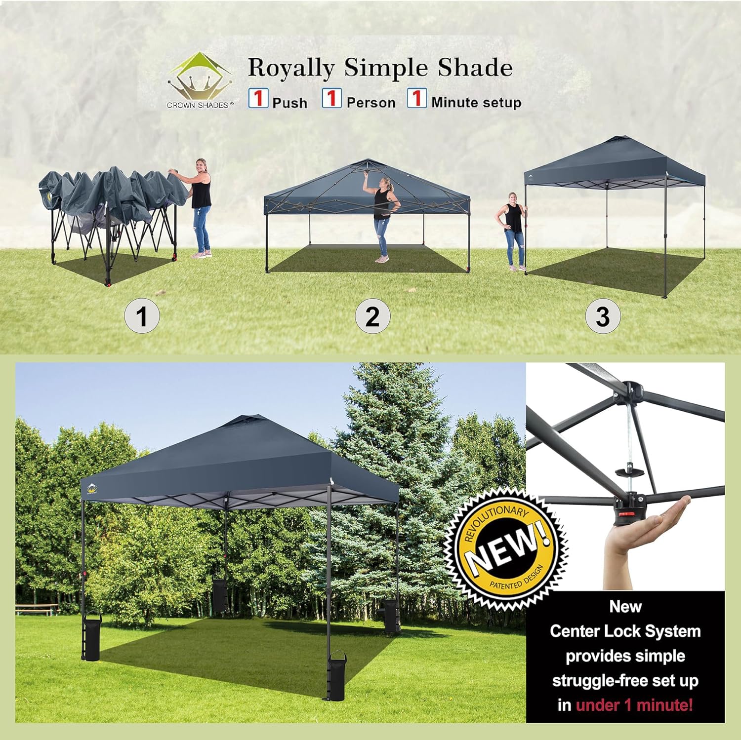 CROWN SHADES 10x10 Pop Up Canopy Tent - Patented Center Lock One Push Instant Outdoor Canopy Beach Tent with STO-N-Go Bag 8 Stakes & 4 Sand Bags,Grid Grey