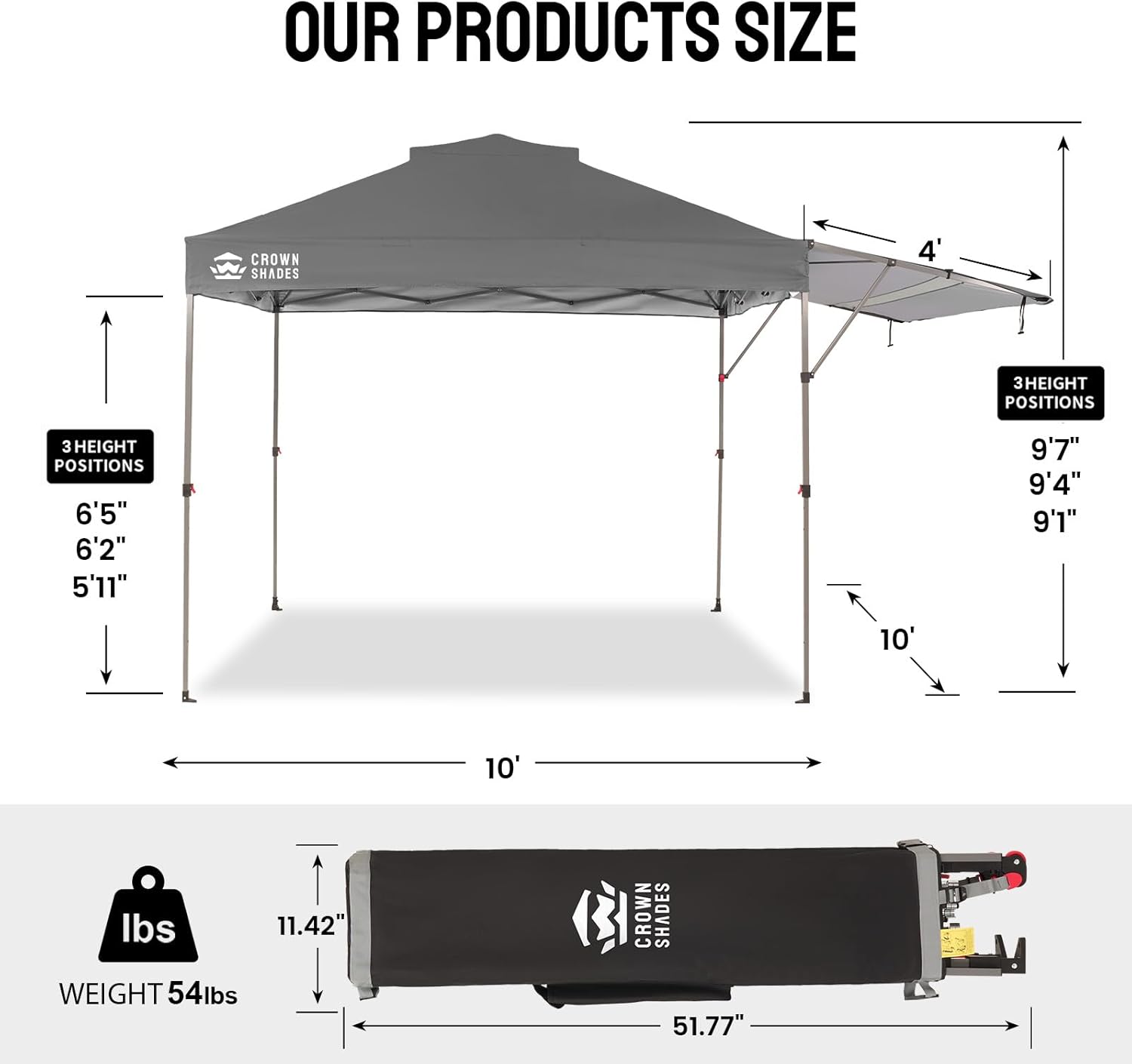 CROWN SHADES 10x10 Pop up Canopy Tent, Instant Commercial Canopy with Extend Awning, Patended Centerlock, 150D Silver Coated Fabric, 4 Ropes, 8 Stakes, 4 Weight Bags, STO 'N Go Bag, Grey