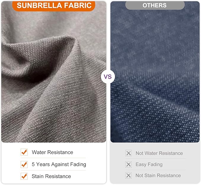 - Sunbrella Fabric - Made of 100% solution-dyed acrylic, 270-gram breathable outdoor fabric, 5 years fade-resistance, it is also mildew, stain, and water resistant, Block over 98% of ultraviolet rays
