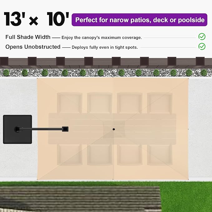 - Extra Large Shading Area: A 13' X 10' large canopy provides a large area shade for multiple people and this patio umbrella is larger than most umbrellas on the market, ideal for your big family and friends at the garden, deck or pool