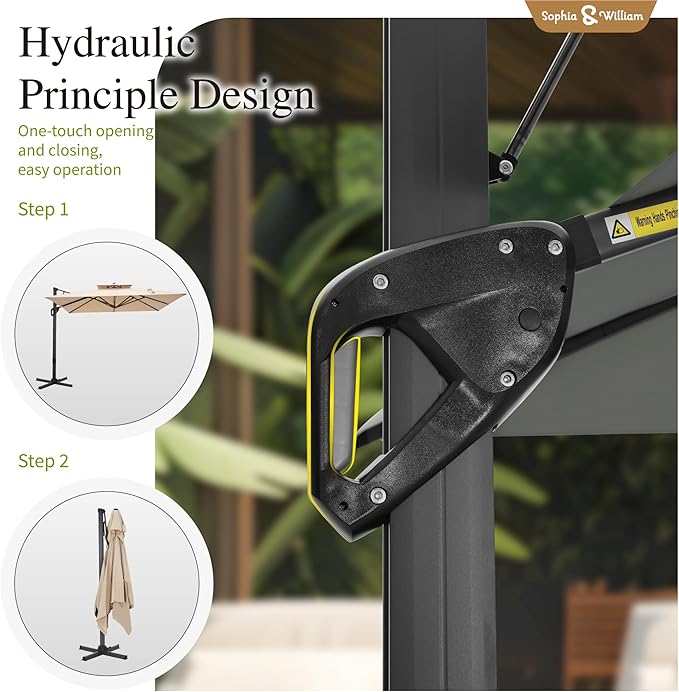 - Hydraulic Design for Easy Use: outdoor umbrella features a smart hydraulic design for effortless opening and closing. This handy push-pull mechanism is more convenient than traditional hand-crank models, making setup quick and hassle-free