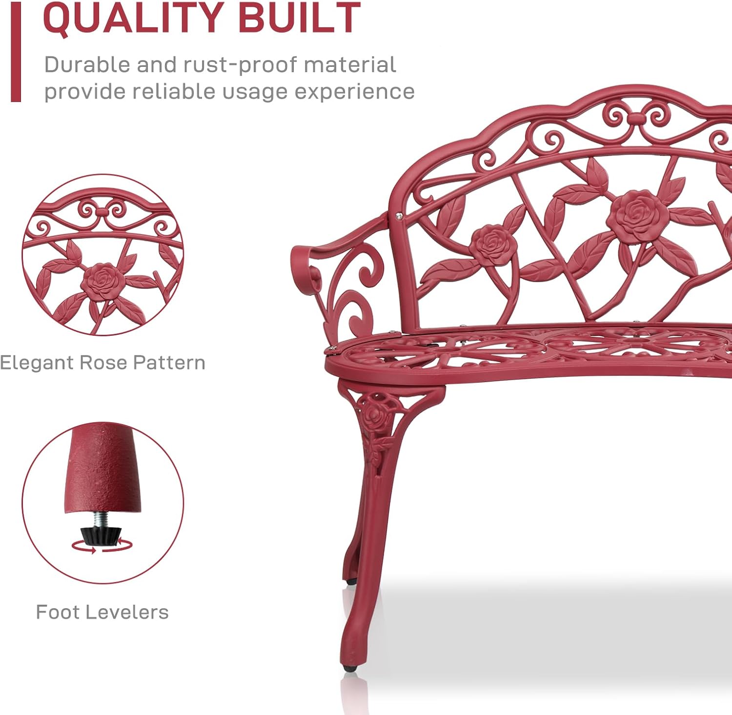VINGLI 38.5" Patio Park Garden Outdoor Metal Rose Bench,Cast Aluminium Frame Antique Finish Chair,Accented Lawn Front Porch Path Yard Decor Deck Furniture for 2 Person Seat(Red