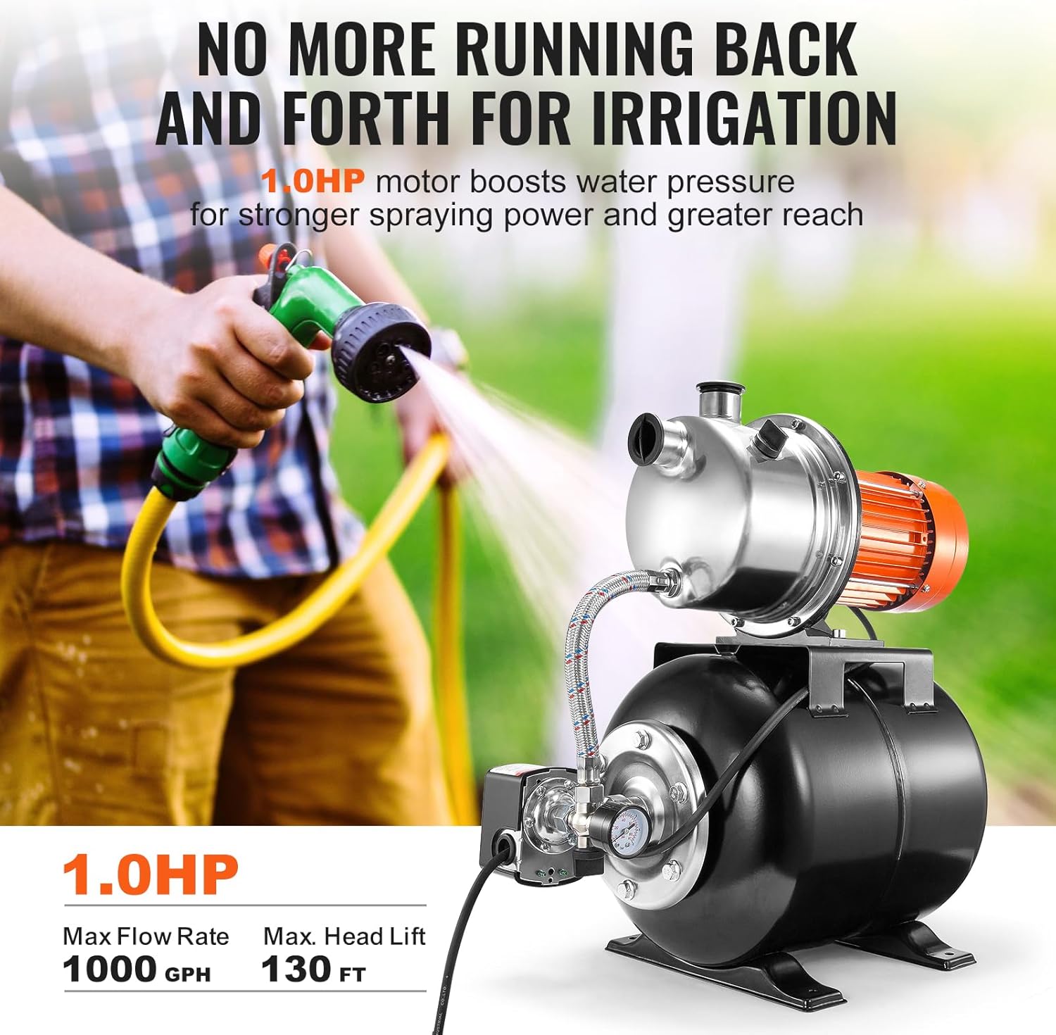 VEVOR 1 HP Shallow Well Pump with Pressure Tank, 1000 GPH, Automatic Irrigation Water Booster Pump with 130 ft Head Lift 20/40 PSI Pressure Switch, 304 Stainless Steel Pump Head for Home Garden Lawn