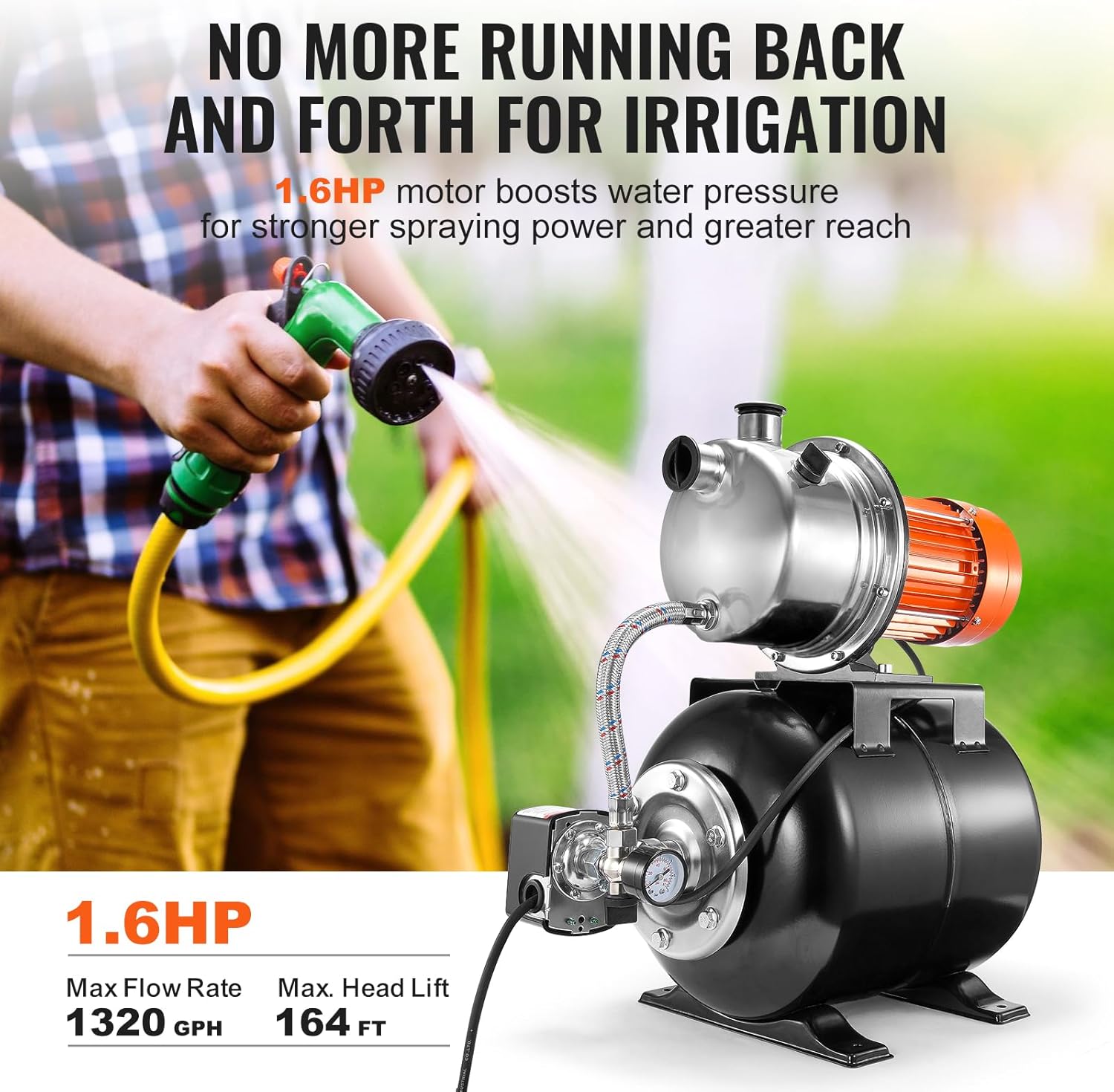 VEVOR 1.6 HP Shallow Well Pump With Pressure Tank, 1320 GPH, Automatic Irrigation Water Booster, 5-Gal Tank 30/50 PSI Switch, Stainless Steel Head for Home Garden Lawn
