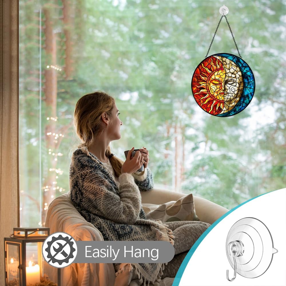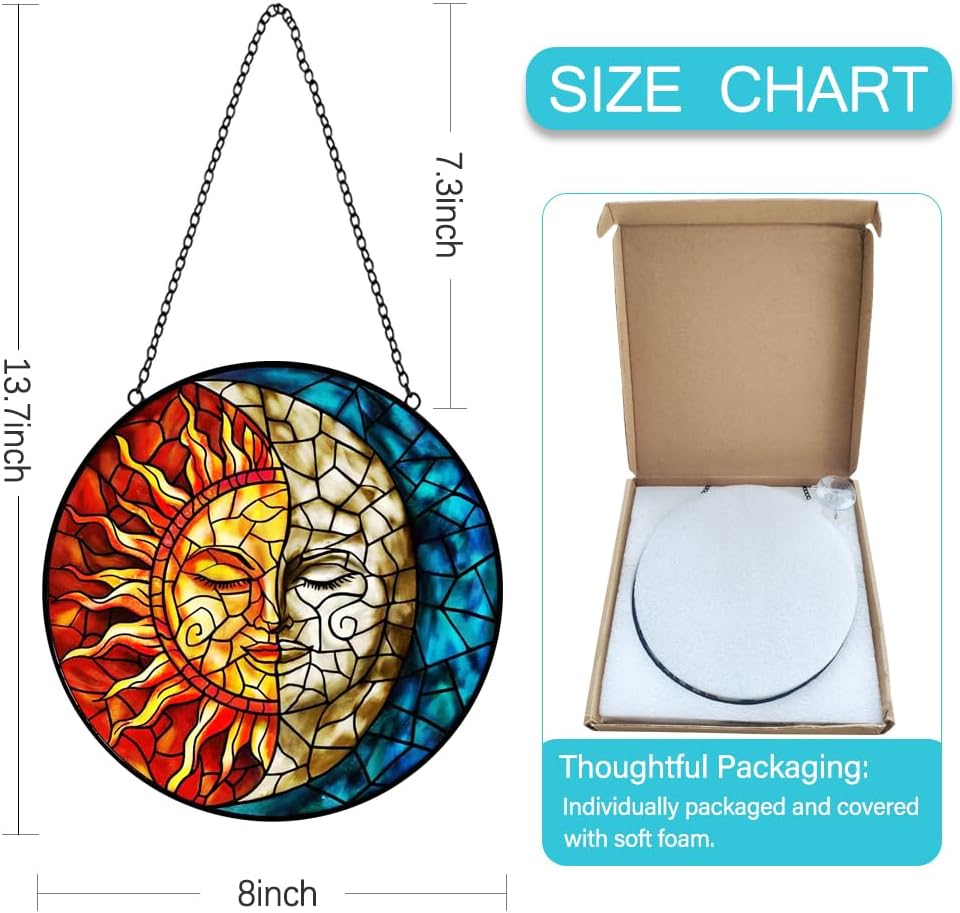 - Glass Art Window Decorations: The upgraded large-size hanging stained glass panels bring you a new decorative experience. This is a very beautiful sun moon suncatchers for windows hanging, size is 8 inches which is perfect for any windows or wall space. Stain glass window hanging is the right size to enhance your home decor without blocking the view, it is a good choice for decorating a house