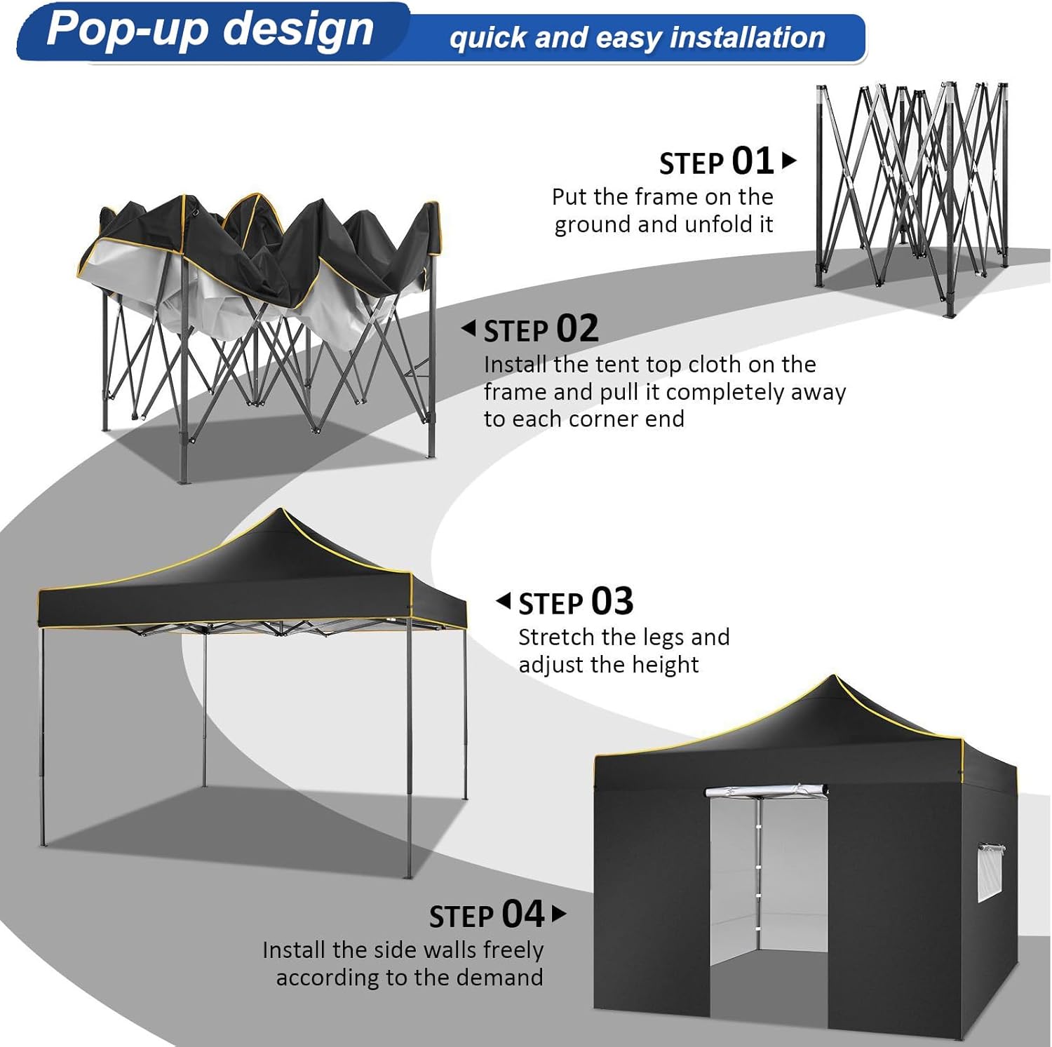 - [Installed in minutes] - Our canopy 10x10 is a pop-up type, the main body is linked in one, there is no splicing installation, and the sidewalls are installed as needed. Detailed instructions are also included. Two people can complete the tool-free installation in minutes.(Top service)- We will fully solve any problem products. We have private technical support experts, please feel free to contact us if you have any questions.