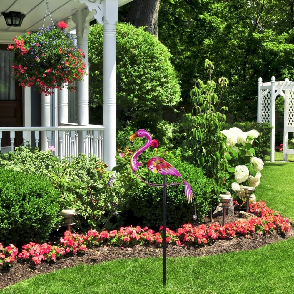 - 【Bright Up Your Garden】This elegant metal flamingo garden stake will add the perfect charm to your yard art, raised garden or landscape beds. The shiny pink body with splashes of gold on the tail brings a rich sparkling color scheme to your garden, guests in your garden won't be able to miss these beautiful and unique metal garden stakes! Measures 47.6 inches tall